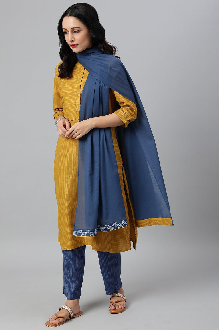 Blue Solid Zari Straight Kurta & Straight pant with Shawl Set