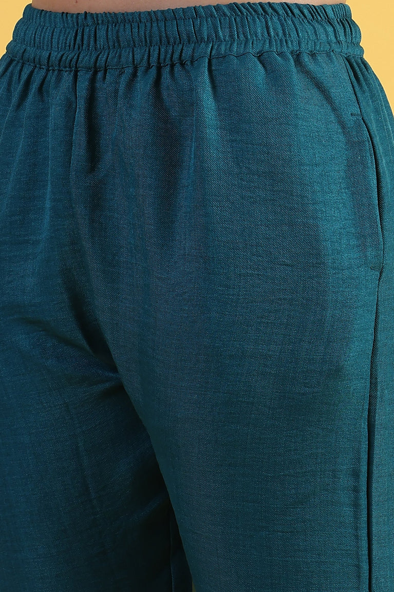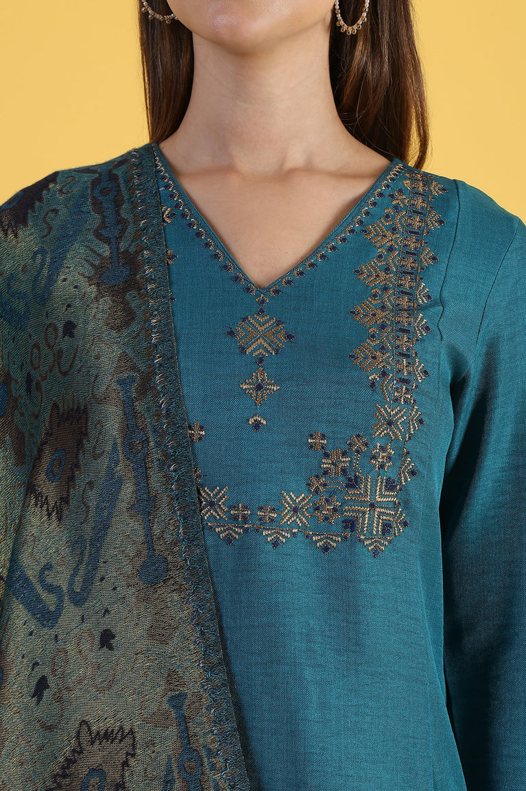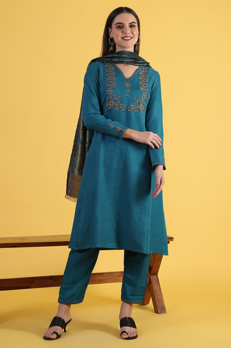 Discover effortless elegance with this women's ethnic set from Brand W. Ideal for casual outings, this fusion ensemble in a captivating teal blue shade comprises a straight kurta, straight pant, and a coordinating shawl. The full-sleeved kurta features a flattering v-neck and is embellished with intricate zari work, adding a touch of traditional charm. Crafted from polyester using a woven construction technique, this set offers both comfort and style. The straight silhouette of the kurta and pant creates a sleek, elongating effect, while the slit detail adds a modern flair. The addition of a shawl provides versatility and extra warmth when needed. Hand-wash recommended to preserve its beauty. This ensemble perfectly balances contemporary design with ethnic elements, making it a must-have for the fashion-conscious woman.