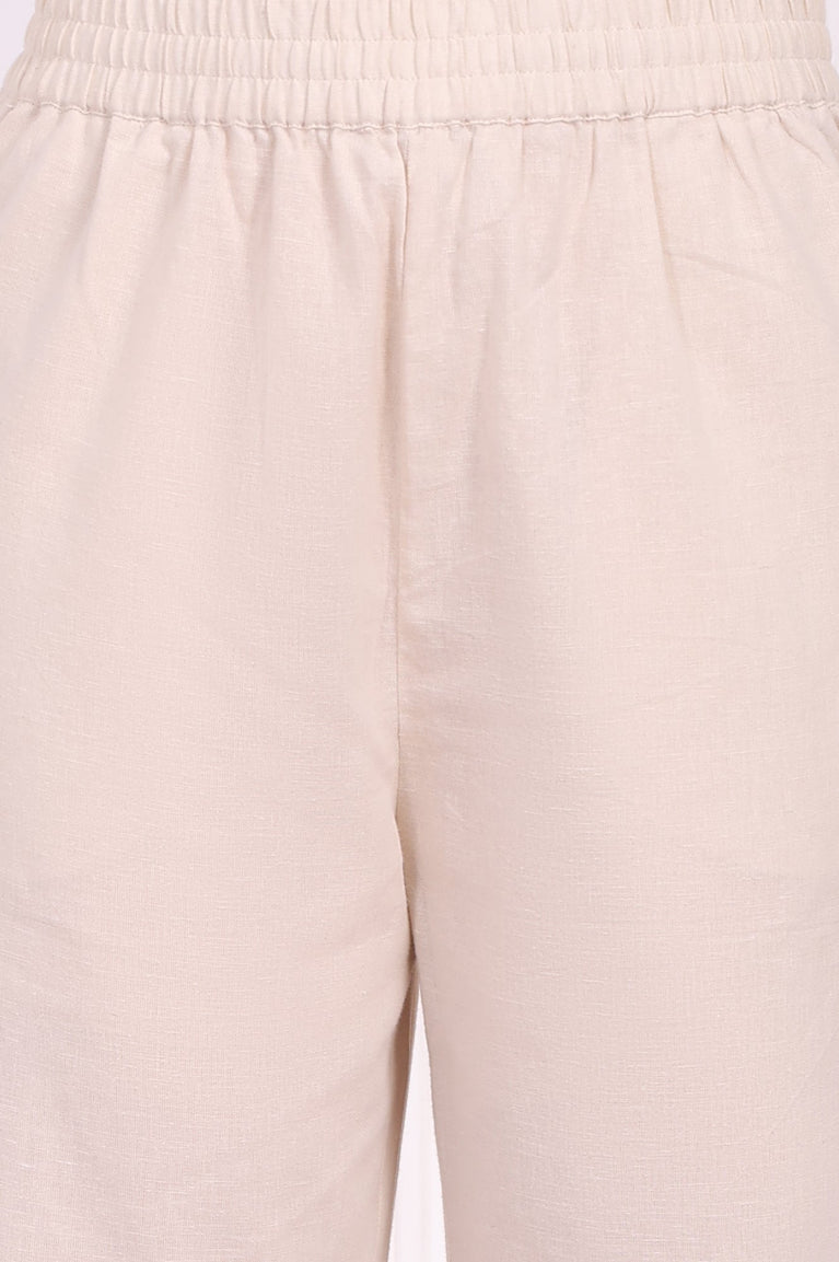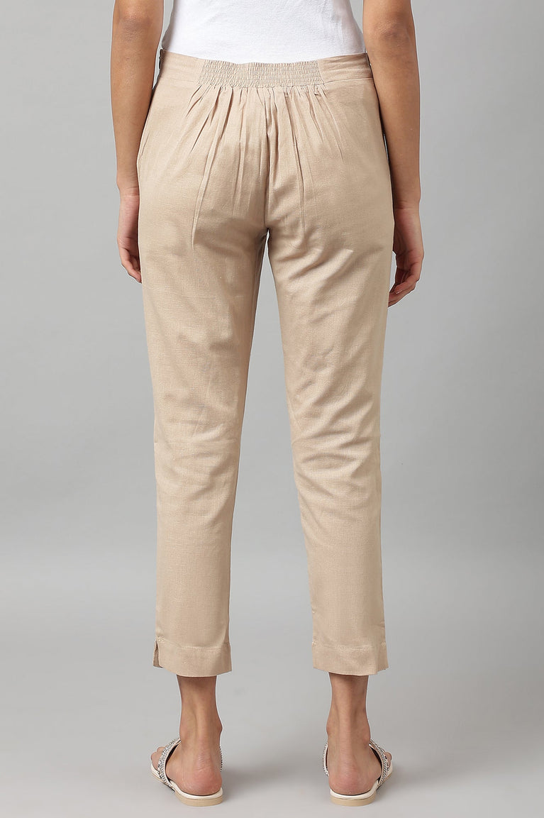Beige Solid Straight Fit Cotton Trousers With Elasticated Waist