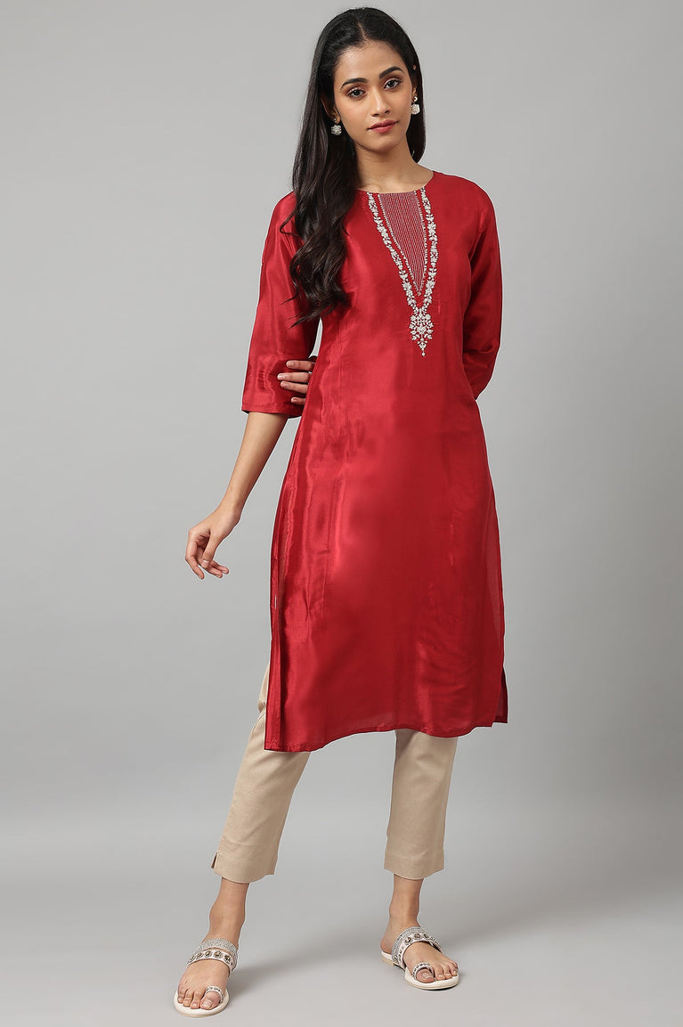 The Schiffli Embroidered Straight Rayon Flax Kurta is a blend of traditional charm and modern aesthetics. Made from a rayon flax blend, it features intricate Schiffli embroidery and a straight silhouette, perfect for festive and formal occasions. Pair it with trousers or leggings for a polished look.