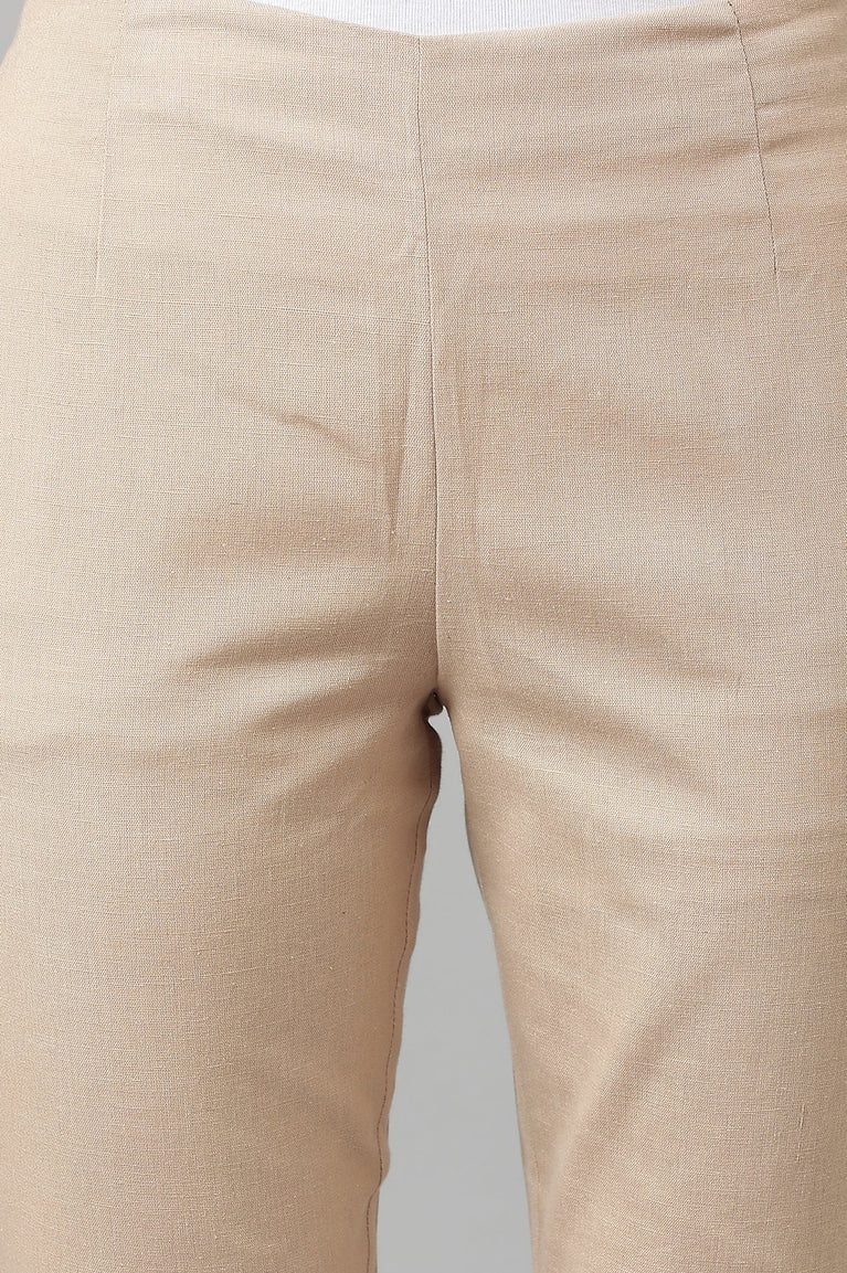 Beige Solid Straight Fit Cotton Pants with YKK Zipper
