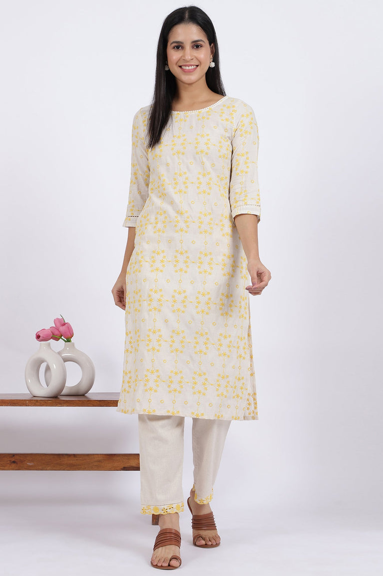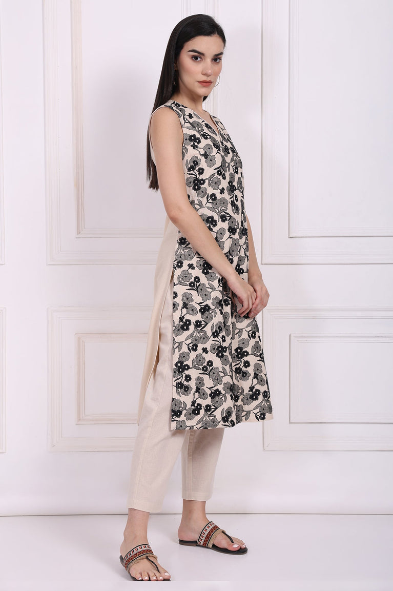 A portrait of modern grace, this Natural Ecru kurta set for women is a study in sophisticated contrasts. The sleeveless A-line kurta glides over the frame, offering a silhouette that’s both flattering and supremely comfortable for all-day wear. Its entire front panel is a canvas for intricate floral embroidery, rendered in a bold black thread that stands out against the serene base, creating a stunning visual texture that feels luxurious to the touch. This beautiful ethnic co-ord set is perfect for those who appreciate detailed craftsmanship. The kurta features an elegant V-neckline, which is delicately finished with a fine lace trim for an added touch of femininity and charm. High side slits on the straight hemline ensure graceful movement, while the solid back provides a moment of chic simplicity. Designed for effortless style, this kurti set is a masterpiece of contemporary ethnic wear. The ensemble includes a pair of minimalist straight pants, crafted from the same comfortable fabric for a cohesive look. These pants come with an elasticated waistband ensuring a perfect, flexible fit and feature a handy side pocket for your essentials. This embroidered kurta pant set is ideal for brunches, festive gatherings, or any day you choose to celebrate your personal style. It’s a timeless two-piece ensemble you'll treasure.