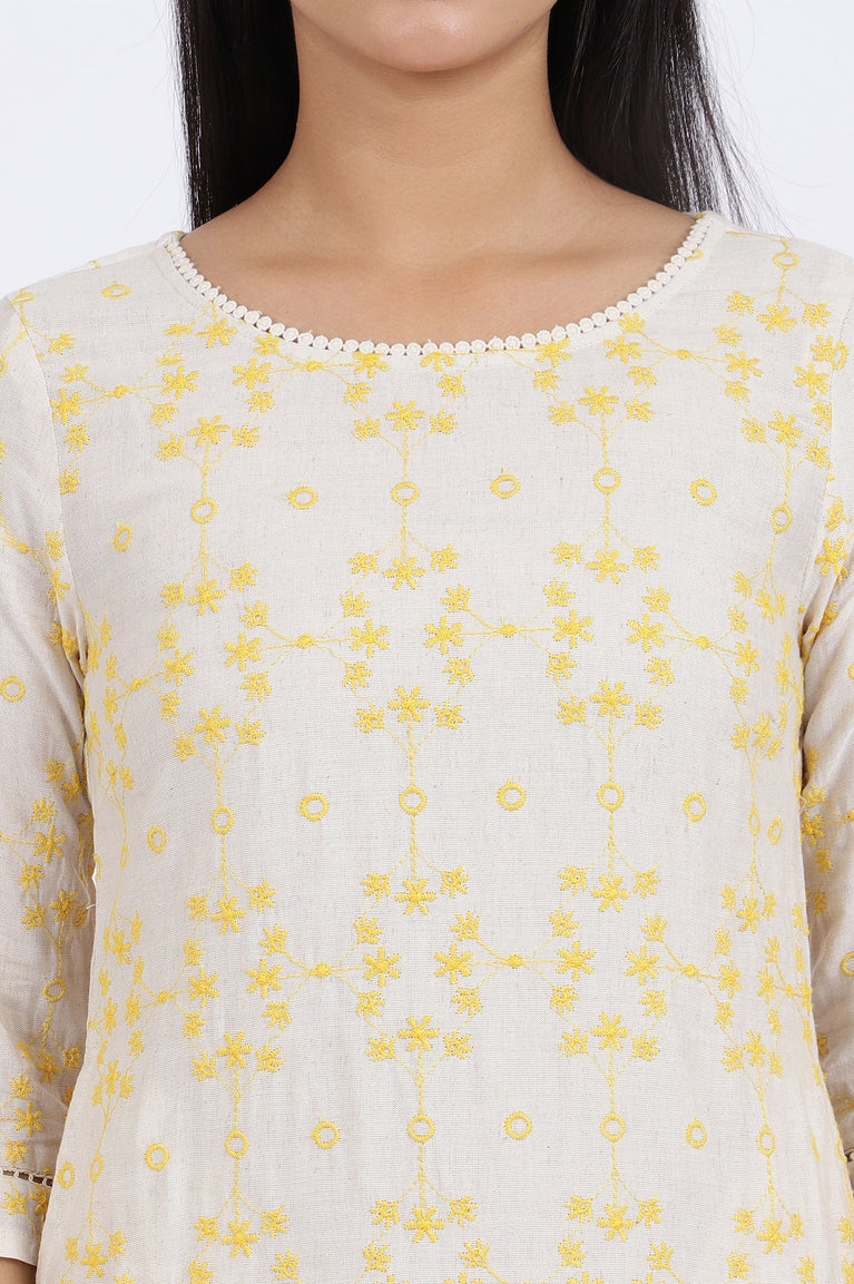 Beige Schiffli Embroidered Straight Rayon Flax Kurta