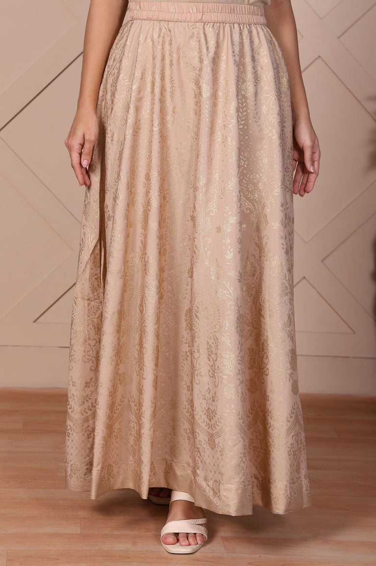 Softly sophisticated! This beige flared skirt for women showcases a stunning gold floral print that exudes ethnic charm. The elasticated waistband ensures comfort, while the flowing silhouette adds elegance to festive gatherings. Perfect for pairing with kurtas or tops, this versatile piece is a wardrobe essential.