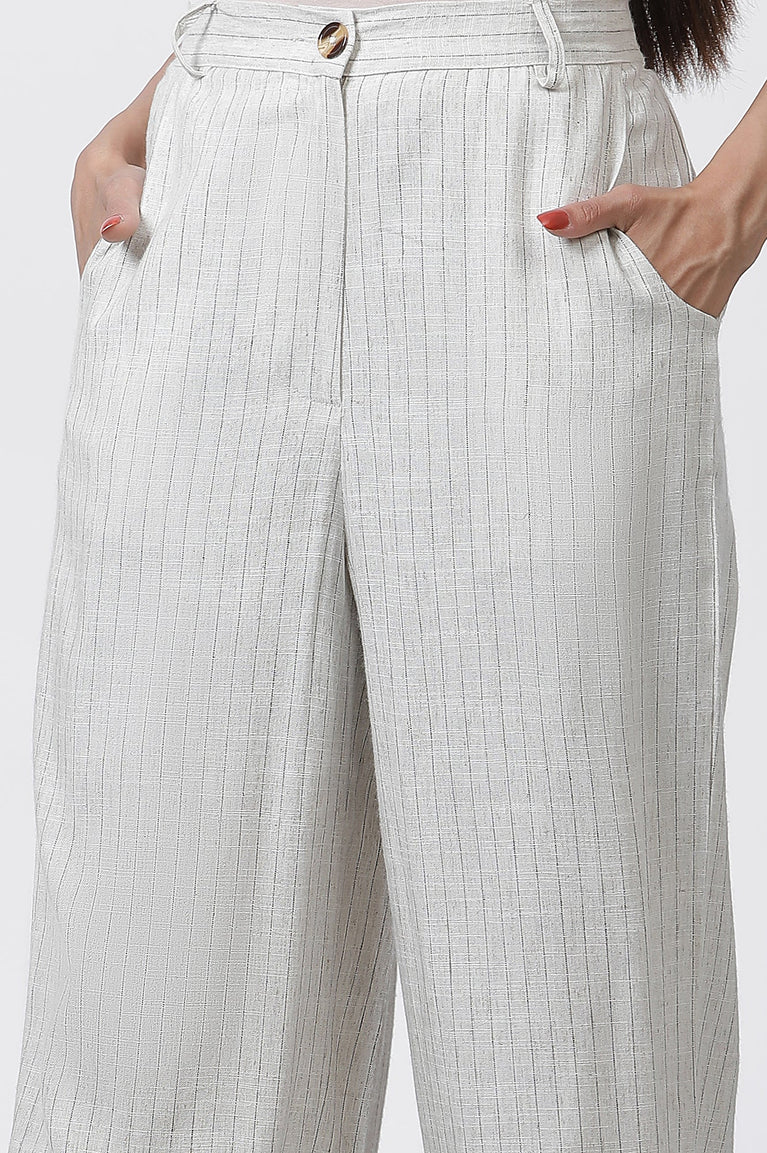 Beige Checkered Dobby Top & Jacket Set. This Sleeveless Top Is Paired With Straight Pants Crafted In Cotton Flax And With Striped Jacket To Complete The Look.