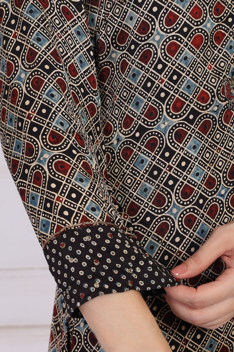 A tapestry of tradition woven into a modern silhouette, this stunning printed kurti for women is a celebration of intricate design. The rich, multi-hued geometric pattern draws inspiration from timeless block prints, creating a visual that's both classic and captivating. It flows in a graceful A-line shape that flatters while it moves, offering a silhouette that feels effortlessly elegant. The design features a sophisticated round neckline detailed with a chic center slit, which is framed by delicate, sparkling embellishments for a hint of festive glamour. You'll love the artistry on the three-quarter sleeves, which are finished with contrasting, embellished cuffs that serve as a beautiful focal point. Crafted from a fabric with a subtle luster that drapes beautifully, this opaque tunic promises all-day comfort without compromising on style. Its versatile calf-length hemline is complemented by traditional side slits, ensuring graceful movement. This printed A-line kurti is the perfect apparel for creating a memorable ethnic look, whether you're heading to a family gathering or a casual day out.
