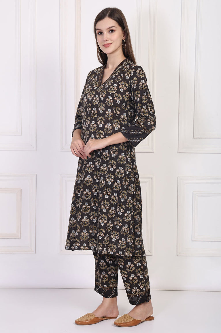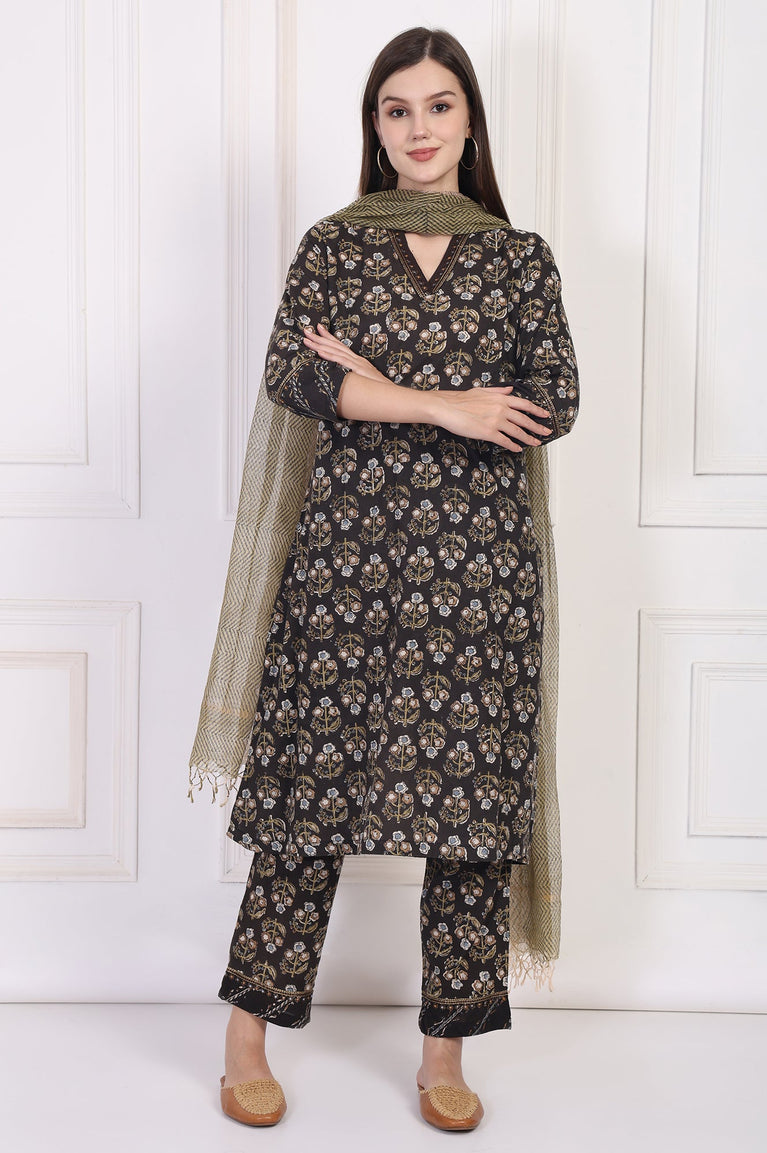 Black Floral Printed Embellished A-Line Cotton Kurta with Straight Pant and Dupatta Set