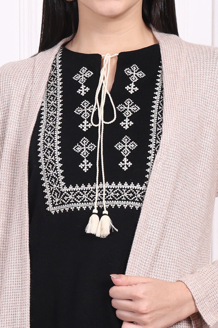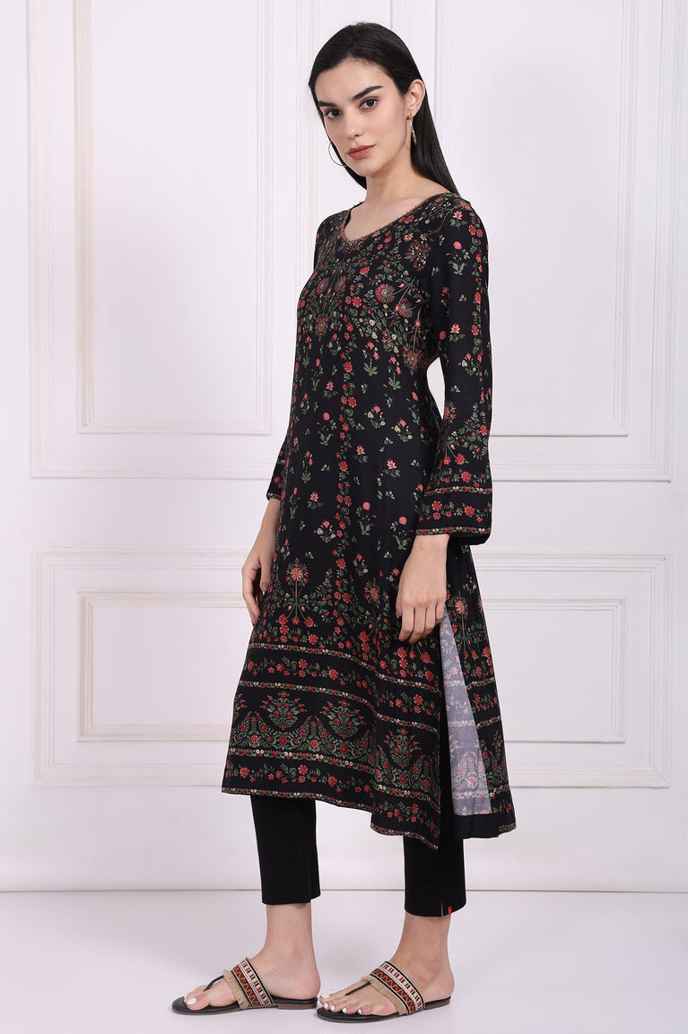 A canvas of midnight garden artistry, this stunning black kurta for women blooms with intricate floral vines in shades of crimson and soft green. It’s a piece that tells a story of timeless style, designed to offer both comfort and a flattering profile that will quickly become a favorite in your collection. The graceful V-neckline is subtly highlighted with delicate thread work detailing on the yoke, drawing the eye and adding a touch of artisanal craft. The three-quarter sleeves provide elegant coverage, perfect for transitioning between seasons. This beautiful apparel falls in a sophisticated straight silhouette, a classic shape that moves with you and allows for effortless layering. Practical side slits are incorporated for ease of movement, enhancing the functional design of this straight ethnic tunic. The hemline is clean and straight, maintaining the kurta's refined structure from top to bottom. Crafted as a fully opaque garment, it ensures complete confidence and comfort throughout your day. You'll find this piece is incredibly versatile, pairing beautifully with contrasting leggings or straight trousers for a complete look. Whether you’re heading to the office, a casual brunch, or a small festive occasion, this long floral print kurta is a wardrobe essential that exudes effortless charm and grace.