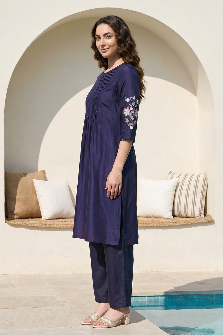 Navy Blue Embroidered Shantung Straight Kurta