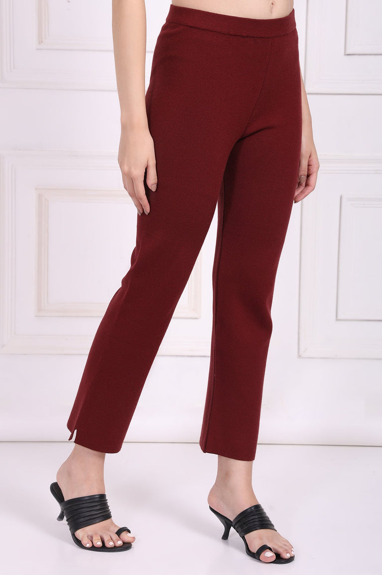 A masterclass in minimalist design, these Deep Garnet trousers for women redefine everyday elegance. Crafted for the modern woman who values both style and comfort, their sleek silhouette offers a foundational piece for countless looks, from the office to an evening out. You’ll find these are the ladies' pants you reach for time and again. They feature a comfortable mid-rise cut that sits perfectly on the waist, flowing into a clean straight-fit leg that provides a universally flattering profile. The design prioritizes ease and a seamless look; a smooth, fully elasticated waistband makes them effortless pull-on trousers, eliminating any bulk from zippers or buttons. A pristine flat front maintains the clean, sophisticated lines, while the pocketless construction further enhances the streamlined silhouette. Cut to a contemporary ankle-length, these versatile knit pants are finished with a subtle side slit at the hem, a thoughtful detail that adds a hint of modern flair and ease of movement. The fabric drapes beautifully and feels exceptionally smooth against the skin, offering the perfect blend of structure and stretch for comfort that lasts all day long. Pair these indispensable maroon straight-leg trousers with a crisp white shirt for a sharp, formal look or a vibrant, printed kurta for a touch of fusion flair.