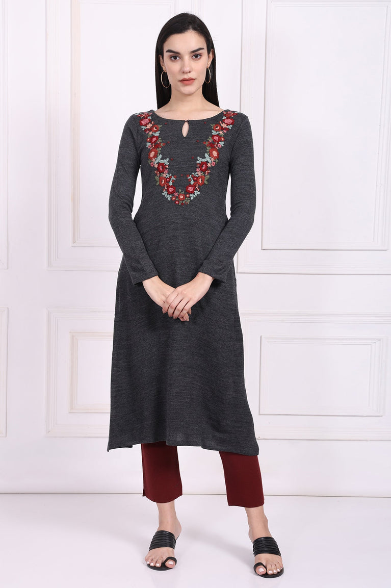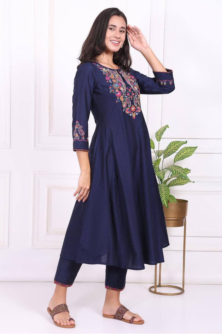 A timeless blend of elegance and tradition, this navy blue Anarkali-style kurta set is a must-have for your ethnic wardrobe. The kurta features intricate embroidery on the yoke and three-quarter sleeves, adding a vibrant touch to its flared silhouette. Paired with straight pants, this set is perfect for festive occasions or family gatherings. The round neckline and flared hemline ensure a graceful and flattering fit, while the embroidered details on the cuffs add a touch of sophistication. Crafted from a woven fabric, this set is both comfortable and stylish, making it a versatile choice for any ethnic celebration.