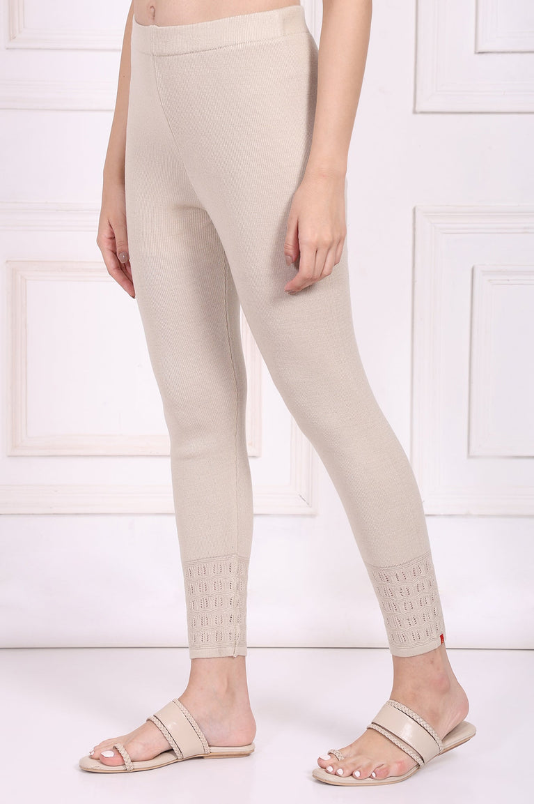 Softly textured elegance! These beige acrylic leggings for women are crafted for winter comfort and style. Featuring a mid-rise elasticated waistband, they offer a snug fit that moves with you. The textured hem design adds a touch of sophistication, making them perfect for pairing with ethnic kurtas or casual tops. Designed for versatility, these full-length leggings are ideal for festive gatherings or relaxed outings. The knit fabric ensures warmth and flexibility, while the solid beige color complements a variety of outfits. A must-have addition to your winter wardrobe, these leggings promise both style and comfort. Word count: 200