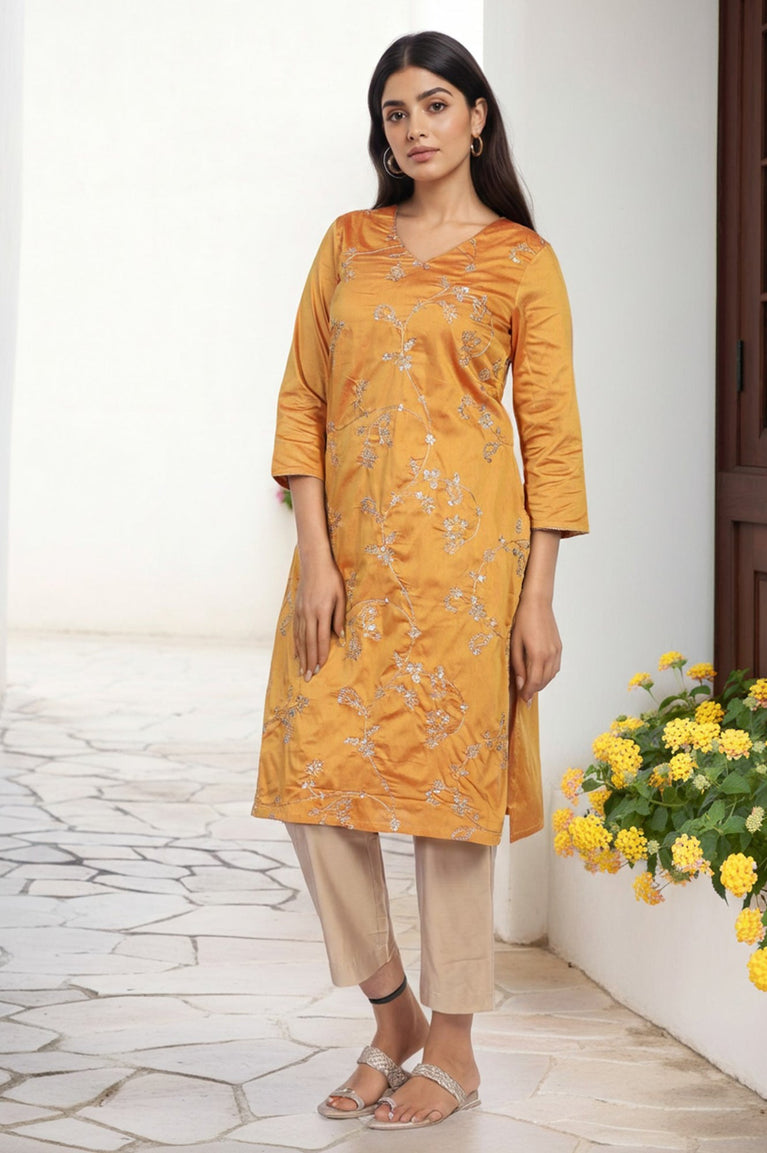 A vision of subtle opulence, this kurta set for women is crafted for moments that matter. The entire ensemble, rendered in a delicate Soft Fawn hue, centers around a graceful A-line kurta that glides with every step you take. Your eyes are immediately drawn to the V-neckline, which is framed by an exquisitely embellished yoke, shimmering with intricate floral embroidery and delicate sequins. This beautiful ethnic co-ord set showcases elegant three-quarter sleeves, finished with their own touch of matching embroidery at the cuffs for a harmonious feel. The kurta’s body is dotted with a subtle buti print, adding a layer of texture before culminating in a clean, straight hemline for a balanced silhouette. It’s paired with comfortable straight pants in a matching solid tone, ensuring a seamless and elegant profile. The true masterpiece, however, might be the accompanying dupatta. Crafted from a light, airy tissue, it features a stunning, artistic floral print with a beautifully detailed border. This complete kurti set, including the A-line tunic, straight pants, and printed dupatta, is a perfect choice for festive gatherings, elegant daytime events, or celebratory dinners where you want to shine with understated grace. The fabric is fully opaque, ensuring graceful coverage and confidence.