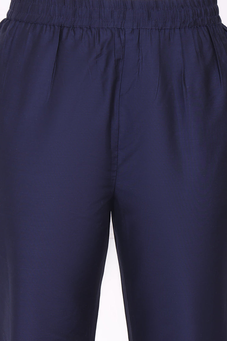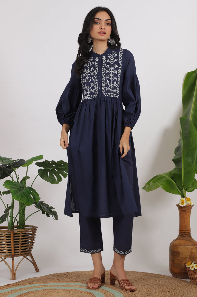 Navy Blue Embroidered Yoke Pure Cotton Kurta and Pants Co-ord Set