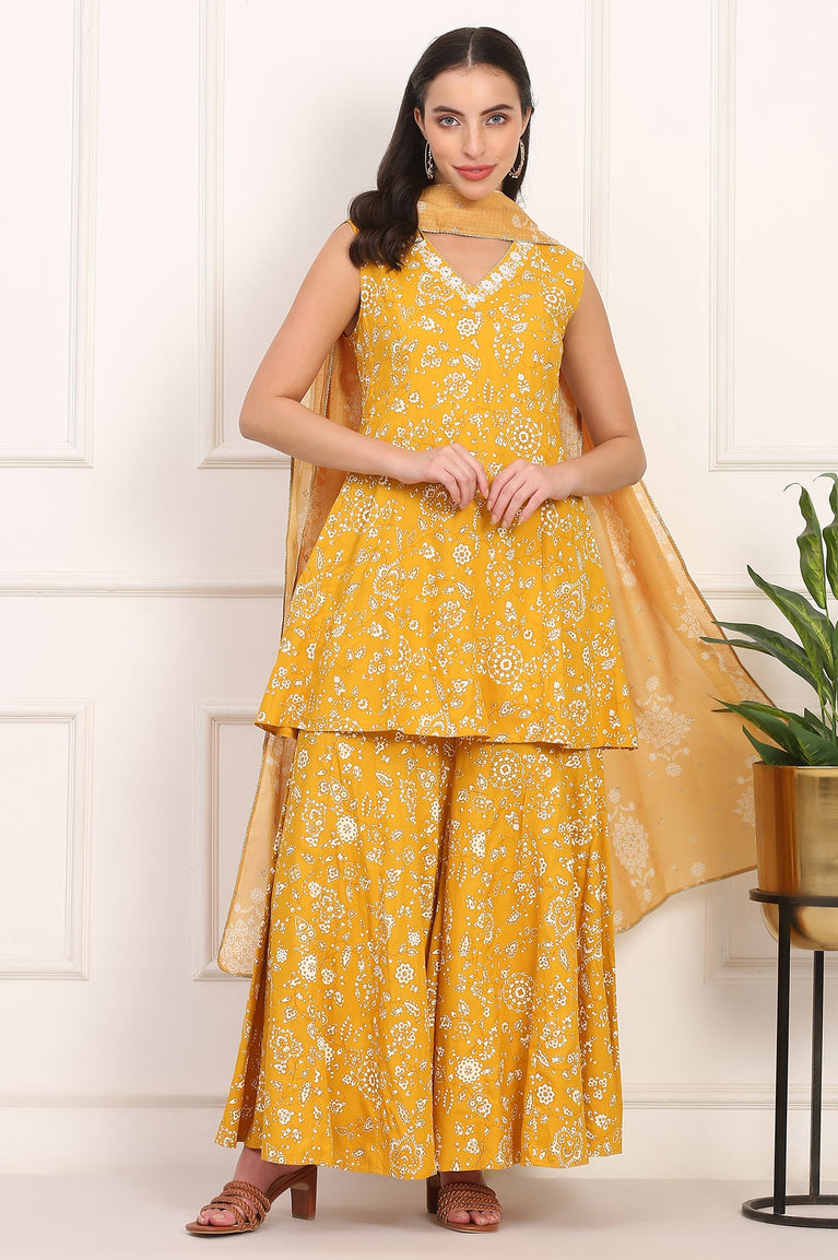 Mango Yellow Floral Printed Embroidered Neck Flared Kurta, Sharara and Dupatta Set