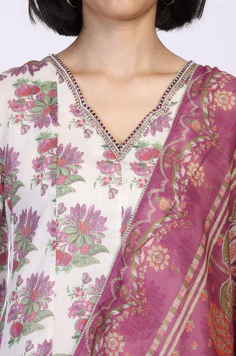 Sunlit elegance meets timeless charm in this beige floral printed kurta set. Featuring a sequined V-neckline, three-quarter sleeves, and a flared silhouette, it pairs beautifully with vibrant purple pants and a matching dupatta. Perfect for festive occasions and casual outings alike.