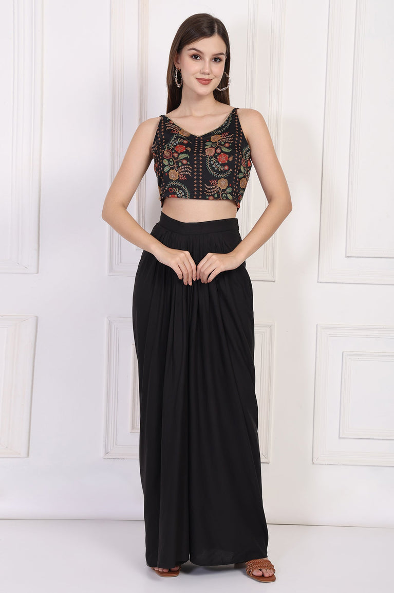 Black Floral Printed Embellished Georgette Crop Top with Cape and Skirt Set