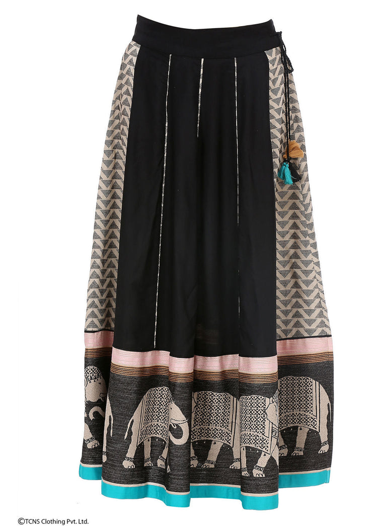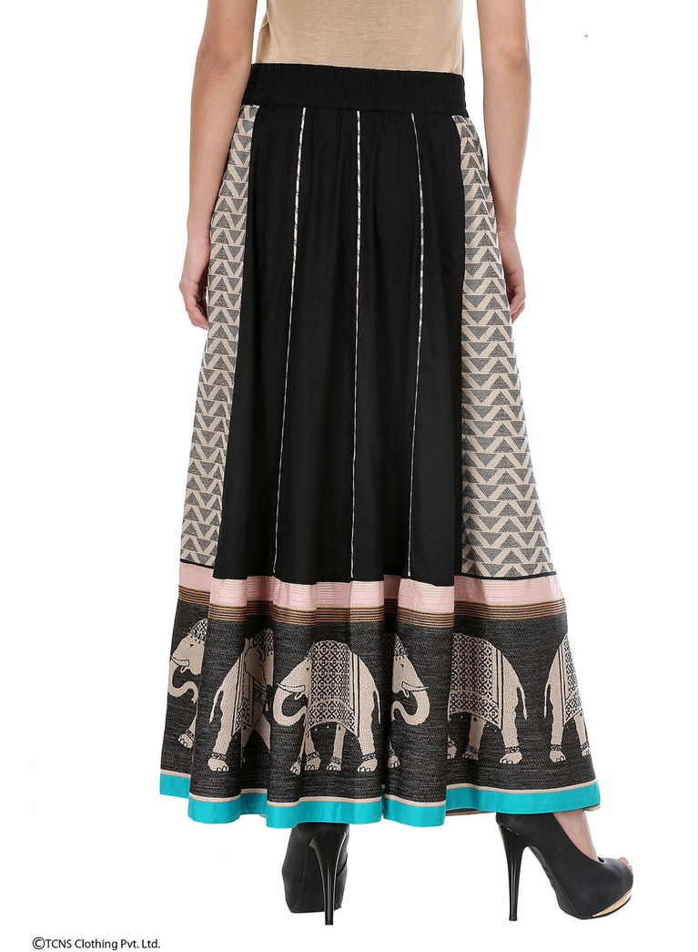 This black and beige printed skirt has printed detail, elasticated back, side zip with tie-up detail and flared hemline.