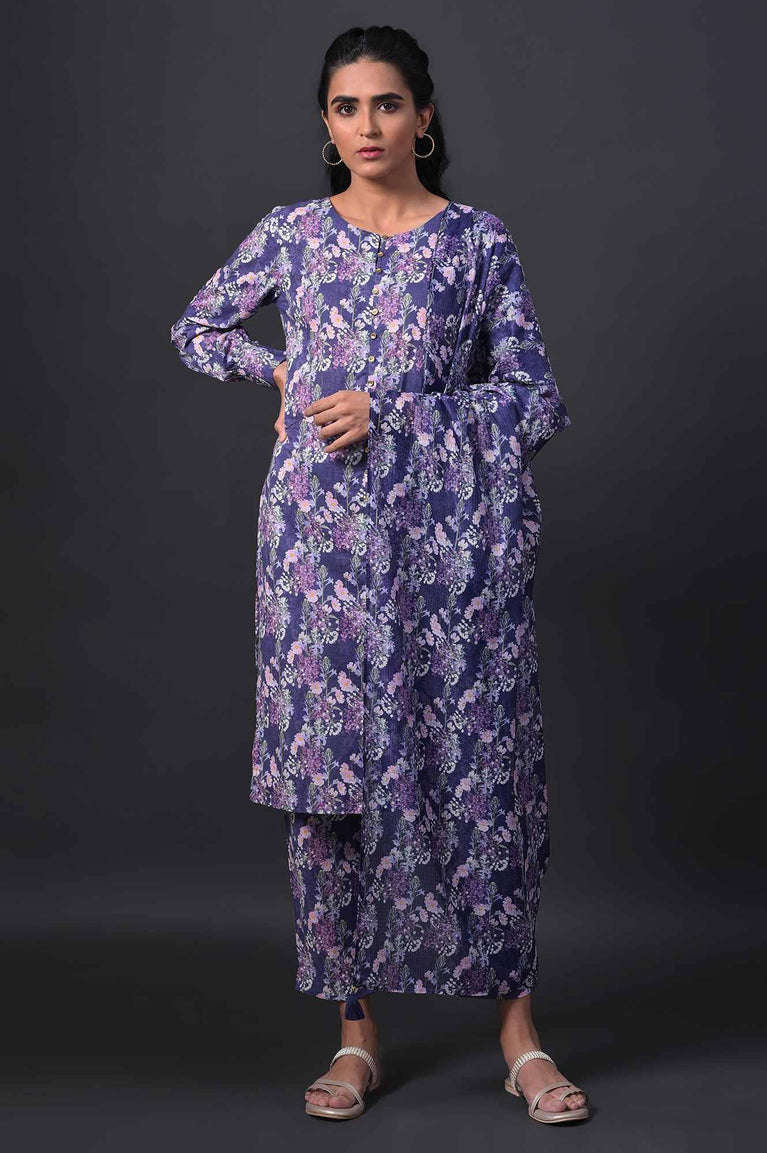 Floral Print kurta Set In Berry Blue Cotton Cambric With Ruched Sleeve Detail. Paired With Slim Pants And Drape In Matching Print. Drape Has Tassel & Button Detail.