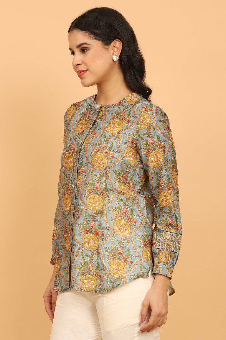 A shirt crafted in handblock printed cotton silk, features border detail at sleeves.