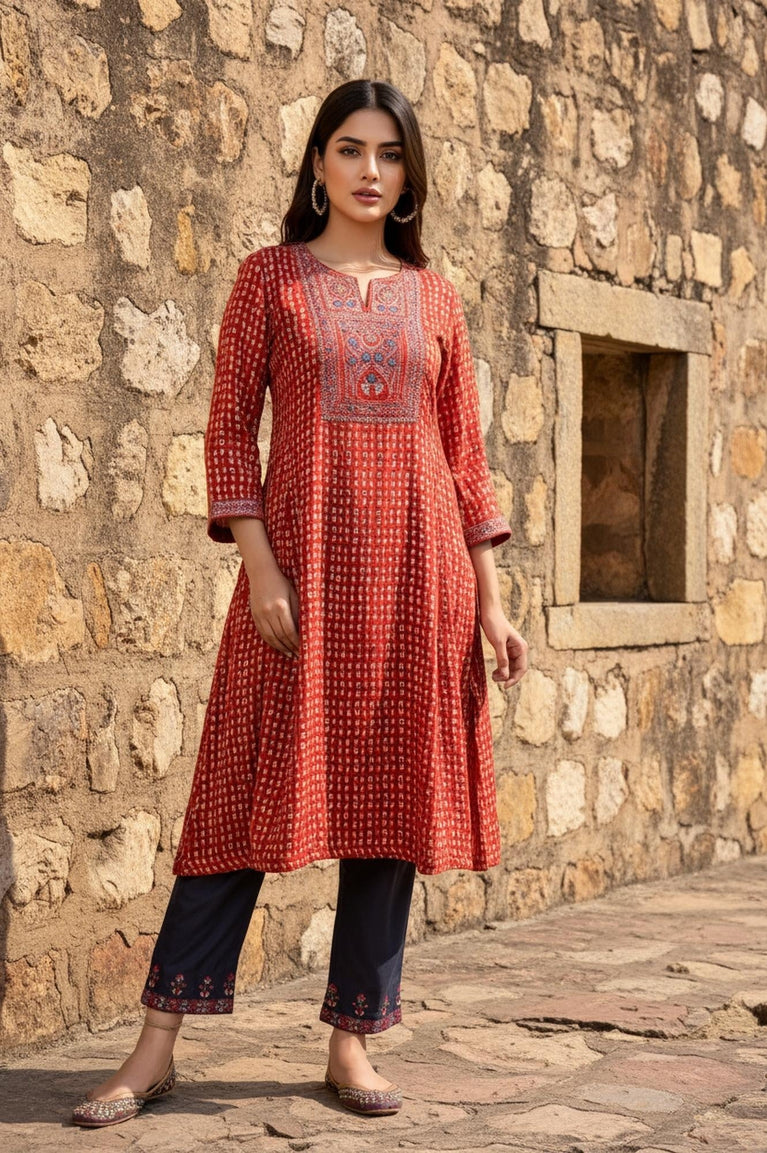 A timeless blend of elegance and comfort, this beige floral A-line kurta for women is a wardrobe essential. The vibrant red floral print adds a touch of charm, while the lace trim detailing enhances its sophistication. Featuring a V-neckline and 3/4th sleeves, this kurta is perfect for casual outings or semi-formal gatherings. The woven modal fabric ensures breathability and a soft texture, making it ideal for all-day wear. Designed with a straight hemline and side slits, it offers ease of movement and a relaxed fit. Pair it with matching bottoms and accessories to complete the look.