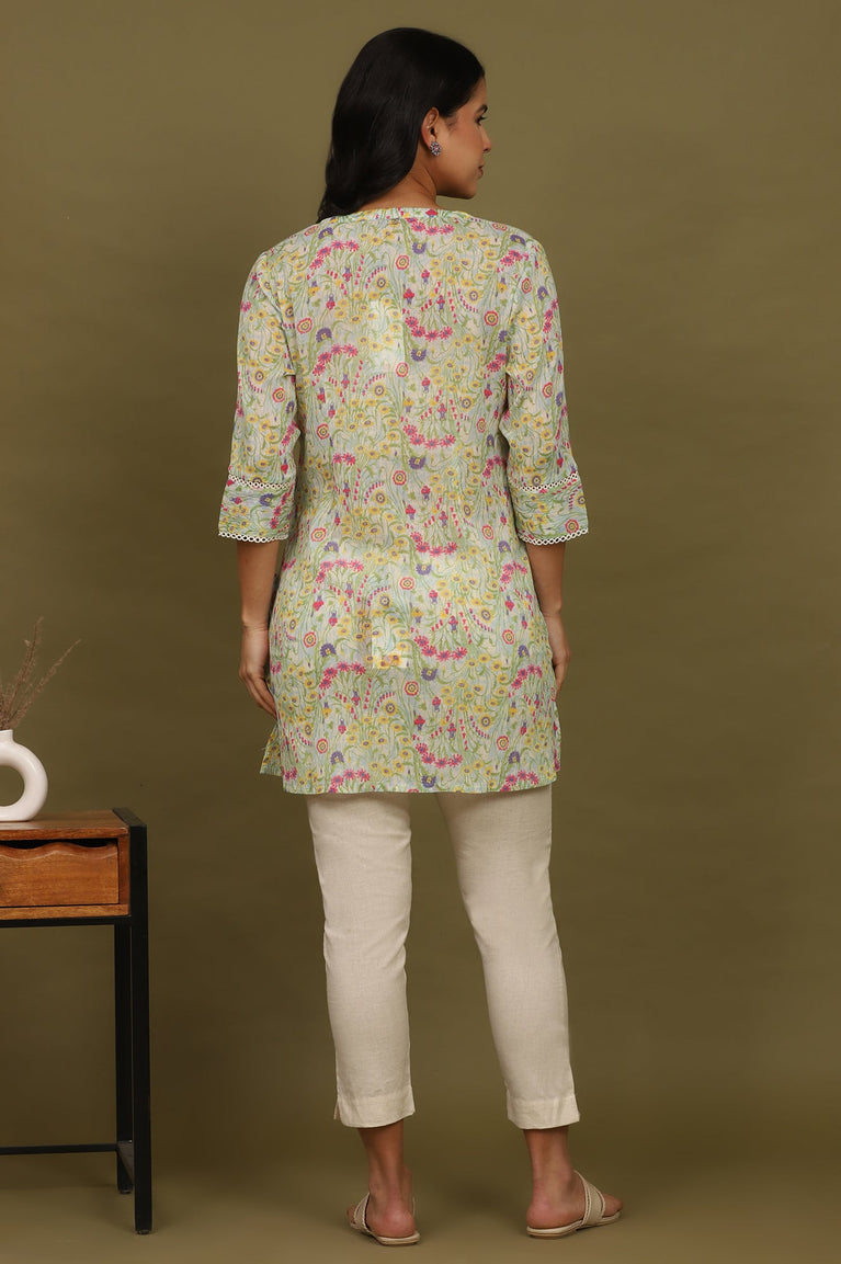 Blue Floral Printed Cotton Crepe Tunic with Lace