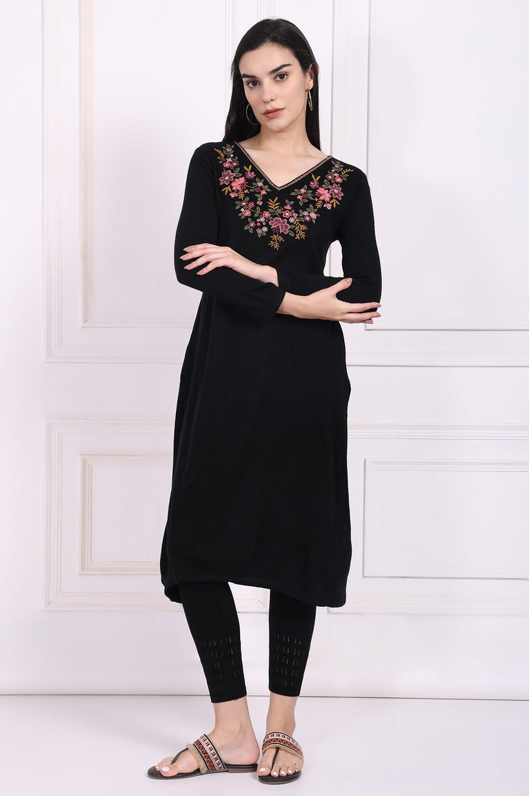 A timeless blend of elegance and charm, this black floral embroidered kurta is crafted from premium Vicuna Crape. The straight silhouette, adorned with intricate thread work, features a flattering V-neckline and three-quarter sleeves. Perfect for festive occasions, its all-over floral design adds a touch of sophistication. Pair it with statement jewelry and heels for an effortlessly chic look.