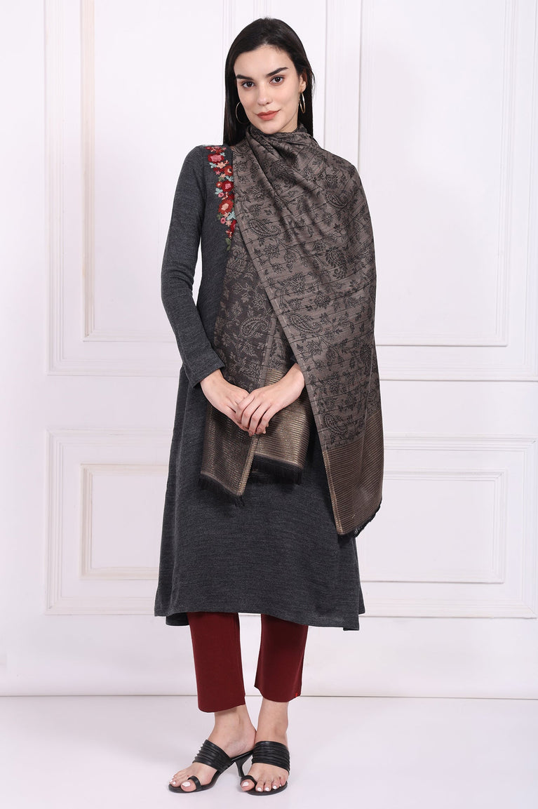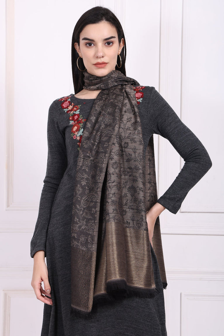 When artistry meets comfort, a piece like this is born. This designer stole for women from W is a true celebration of traditional craftsmanship, designed to become a cherished part of your wardrobe. Woven from a thoughtful blend of soft cotton and warm wool, its rich, deep brown canvas drapes with an elegant, substantial feel perfect for cooler evenings. The entire surface is a canvas for an intricate, yarn-dyed jacquard pattern, featuring timeless paisley and floral motifs that tell a story of heritage. This ethnic dupatta is framed by a magnificent, shimmering gold-toned zari border, adding a touch of regal opulence that beautifully catches the light. As a versatile stole, its generous length of two meters allows for graceful draping in multiple styles, whether over the shoulders or elegantly wrapped. The fabric is completely opaque, providing sophisticated coverage, and is finished with classic short fringes for an authentic touch. You'll find this winter shawl is the perfect companion for festive occasions, weddings, and formal events, effortlessly elevating any ethnic ensemble with its quiet luxury and detailed beauty. It's more than an accessory; it's a statement of refined taste.