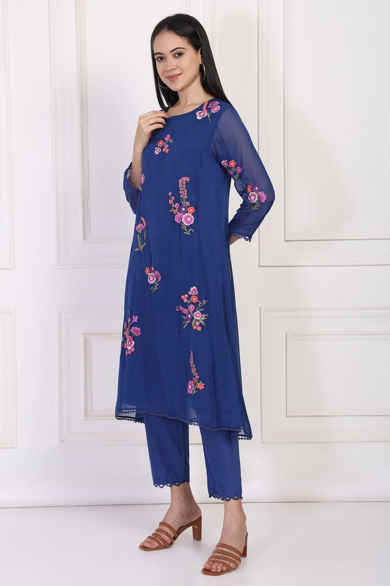 Blue Ari Embroidered Panelled Kurta, Straight Pants and Dupatta Set