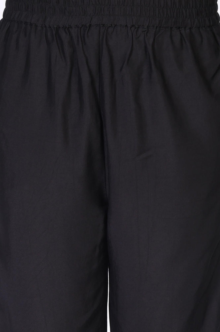 Velvet-smooth elegance meets ethnic charm in these black silk straight pants. Designed with a mid-rise drawstring waist, these trousers for women offer a relaxed fit that drapes effortlessly. The ankle-length hem is adorned with intricate floral embroidery, adding a touch of festive sophistication. Functional slant pockets enhance practicality, while the woven silk blend fabric ensures a luxurious feel. Perfect for pairing with kurtas or tunics, these embroidered pants are ideal for festive occasions, casual outings, or elevated streetwear looks.