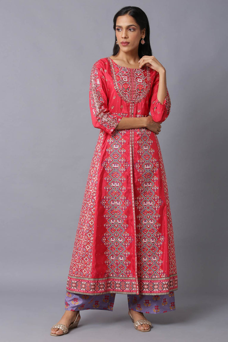 A Perfect Wedding Guest Pick, This Blue Kurta And Red Skirt Is A Vibe. The Kurta Is Embellished With Mukaish Placement Print And Paired With Red Printed Flared Skirt.