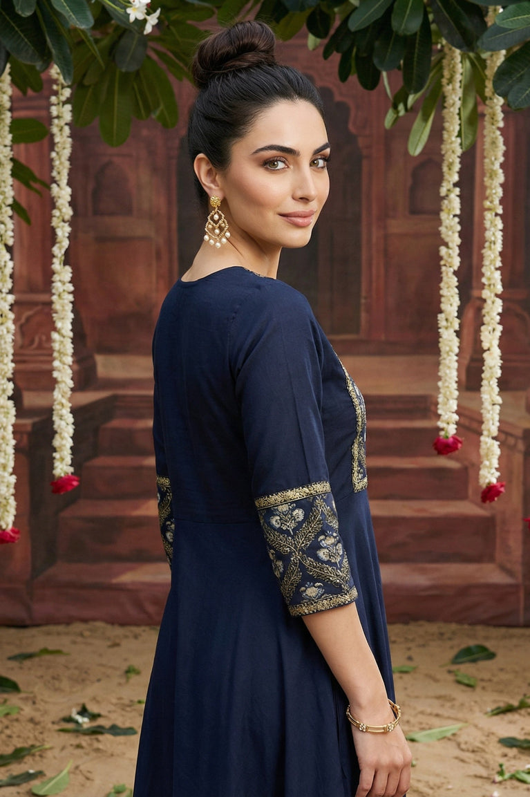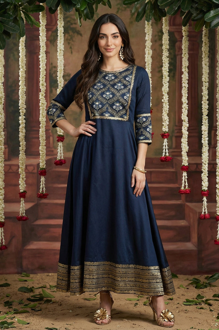 This blue panelled embroidered flared dress is an elegant festive choice. With intricate embroidery across the panels and a flowy silhouette, it exudes graceful movement and charm. Designed for festive gatherings and evening occasions, this dress is a stylish option for women who want ethnic elegance with a modern twist. Its flattering flare enhances feminine charm, while the embroidery adds richness to the ensemble. Pair with statement jewelry and ethnic heels for a complete festive look. Comfortable and stylish, it’s a dress you’ll treasure for special moments.