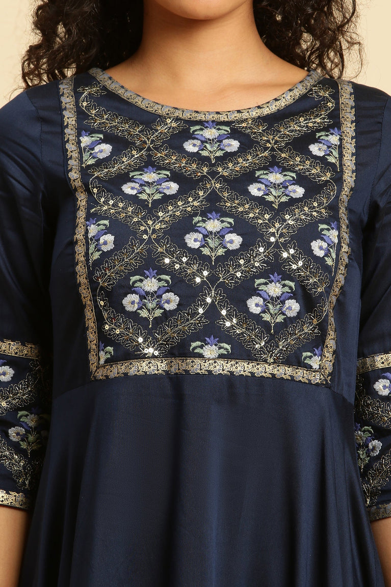 Blue Panelled Embroidered Festive Flared Dress