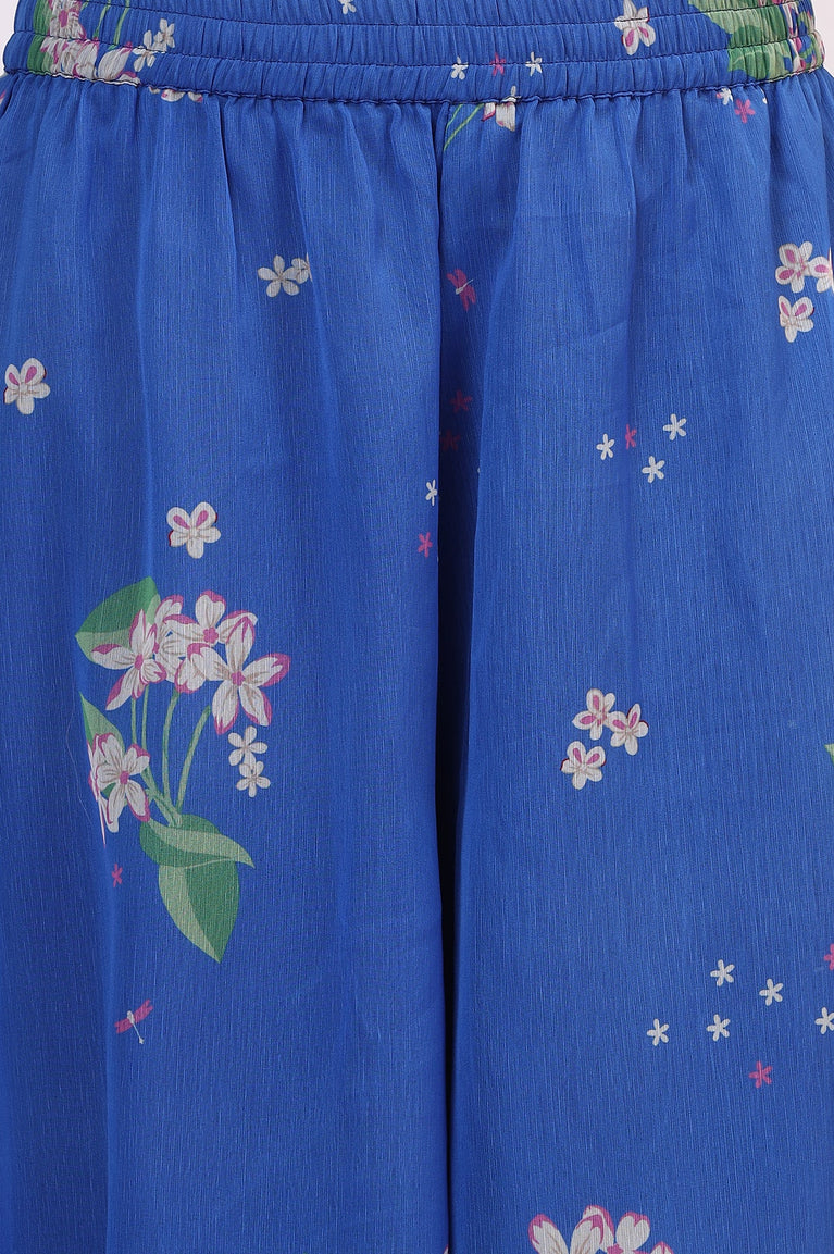 Blue Floral Printed Halter Neck Chiffon Kurta with Flared Pants and Dupatta Set