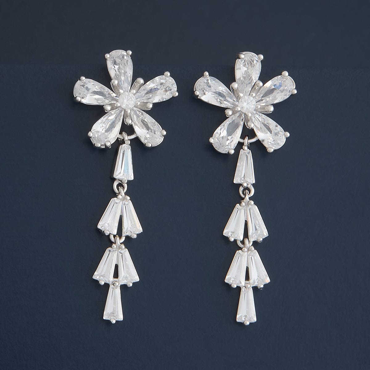 Achieve effortless style with these 92.5 silver earrings from Kushal's Fashion Jewellery. Featuring stunning white zircon stones, they add a touch of sparkle to any look. Crafted from 92.5 silver, these flower-shaped hangings are available in gold, rose gold, or rhodium polishes to choose from.