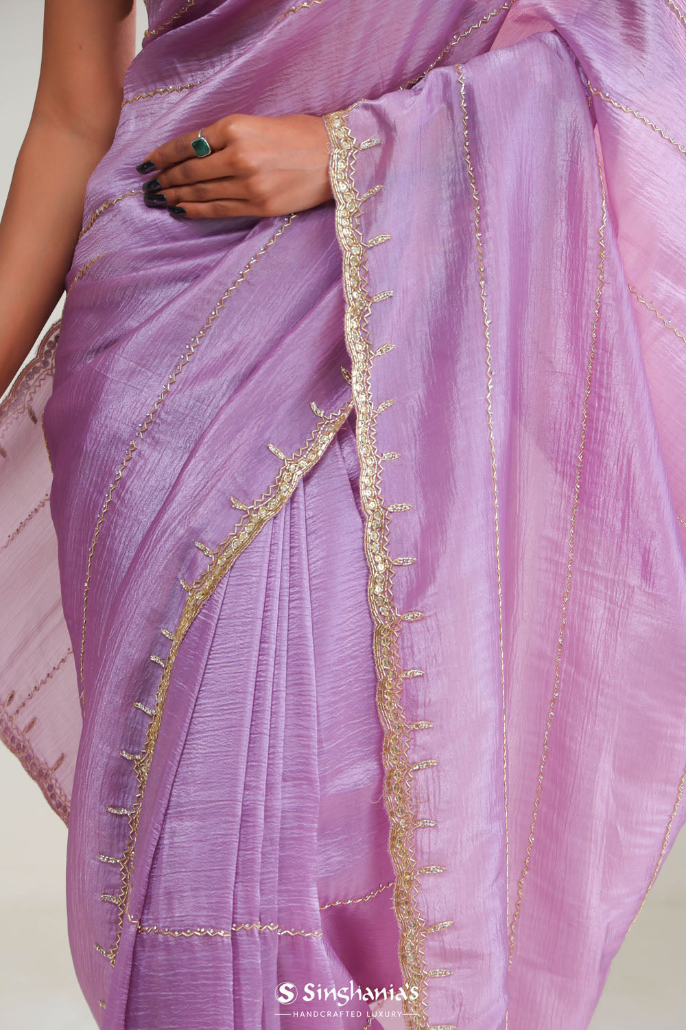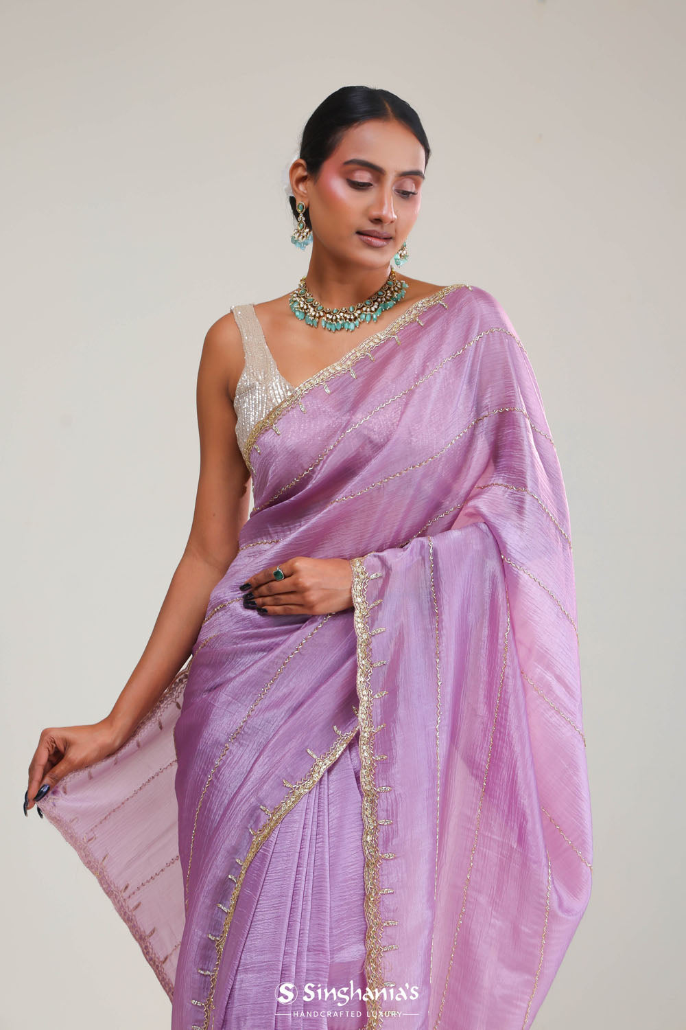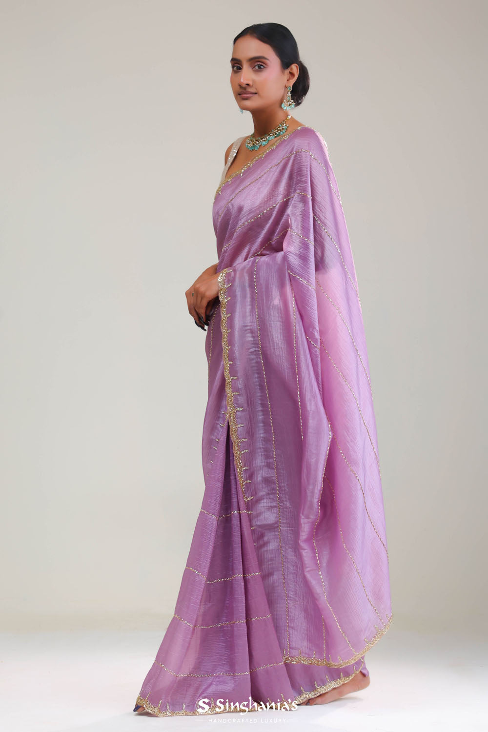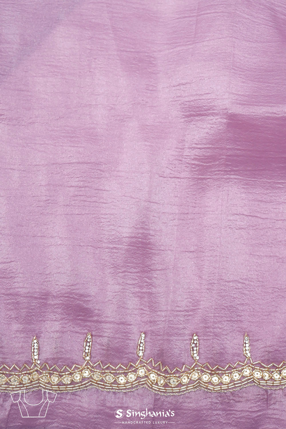 This beautiful african violet tissue saree is ideal for weddings and festive celebrations. The intricate stripes embroidery in glass beads and sequins crafted designs, which are enhanced by a delicate floral border, creating a luxurious and refreshing look.