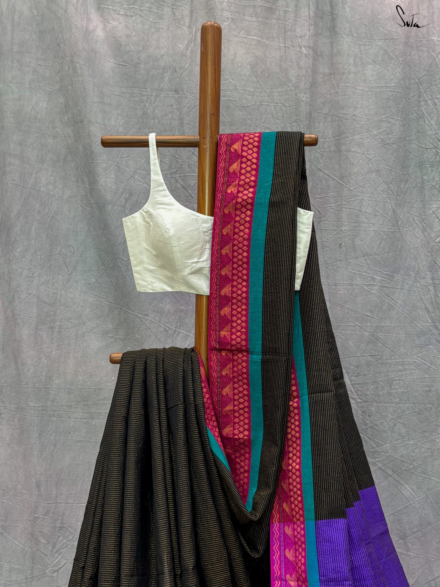 The exquisite 'Andheri Raat' saree is crafted from rich acrylic cotton with zari and features a contrasting pallu that playfully complements the black base. A contrasting thick zari border adds an extra layer of charm to this beautiful ensemble. Pair it with Suta's 'Surabhi' blouse and experience the colorful magic behold!