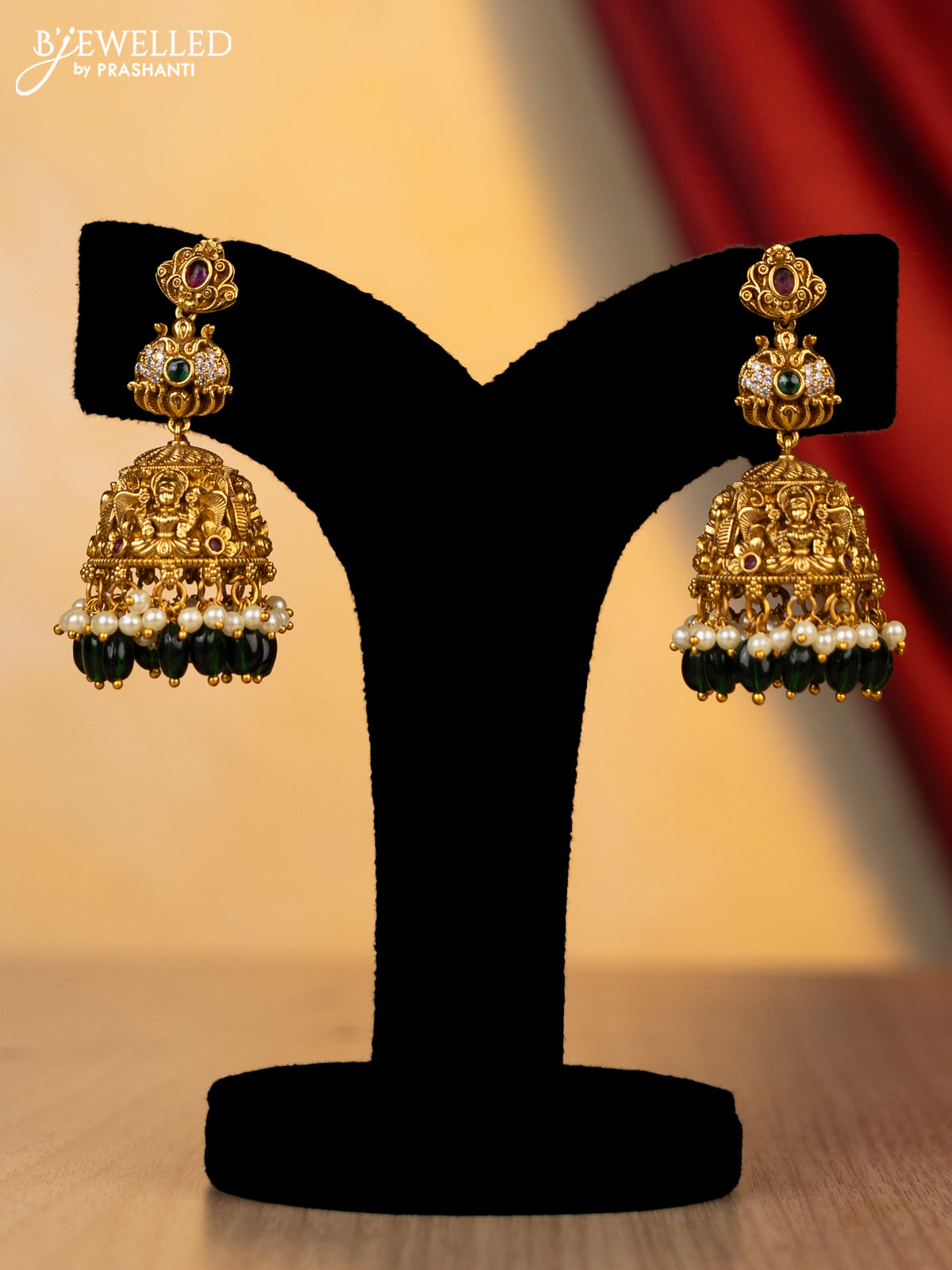 Antique necklace lakshmi design with kemp,cz stone and green pearl beads hanging