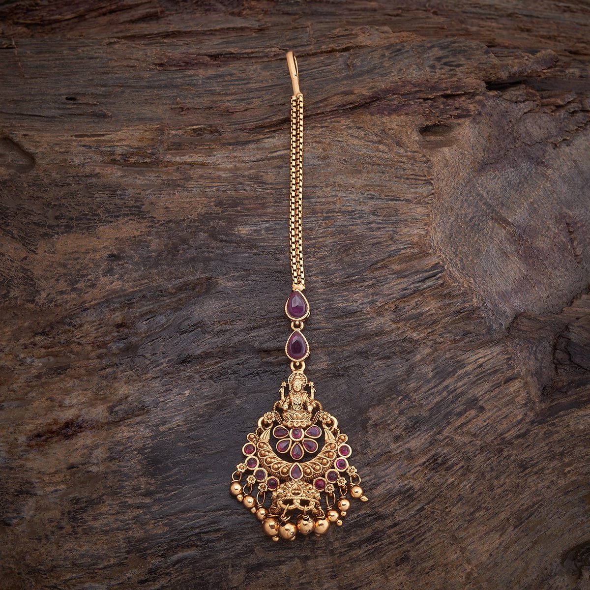 Add a touch of refinement to any ensemble with this charming antique tikka! It is ideal for any traditional attire with its green stones set on a gold-polished copper alloy base. The tikka is also available in ruby and ruby-green colours. Upgrade your hairdo with this exquisitely made piece.