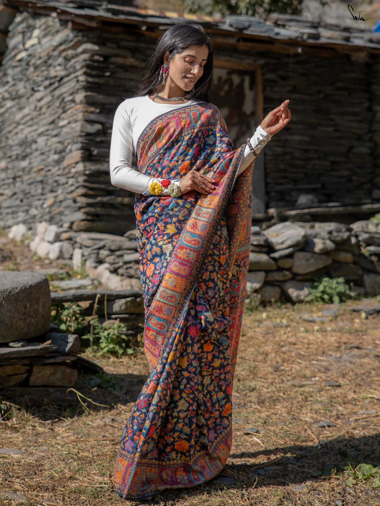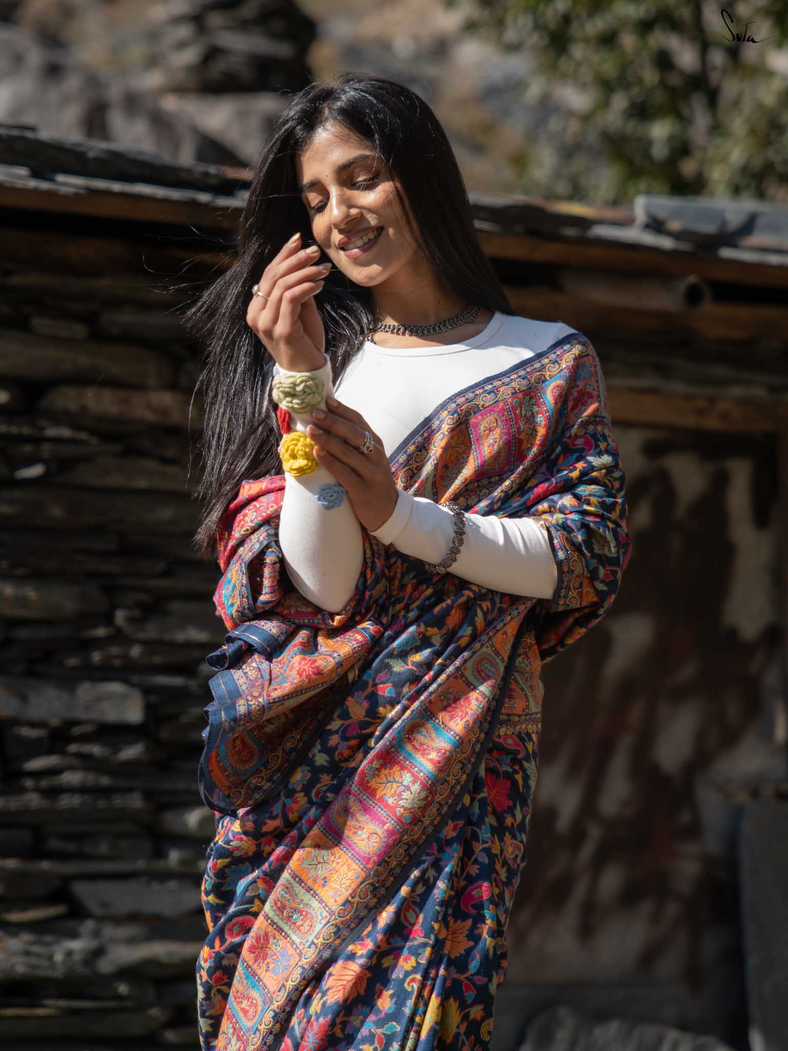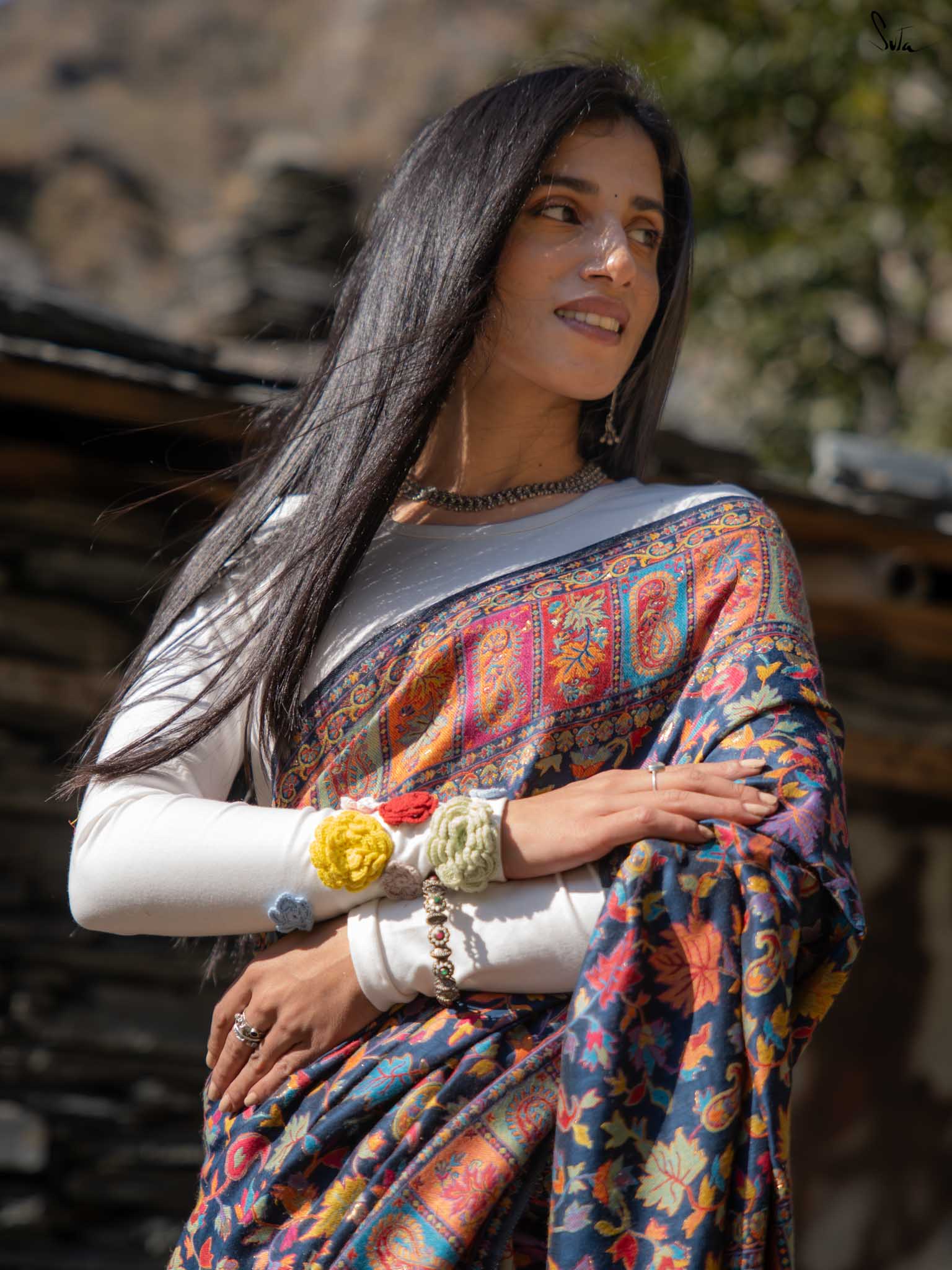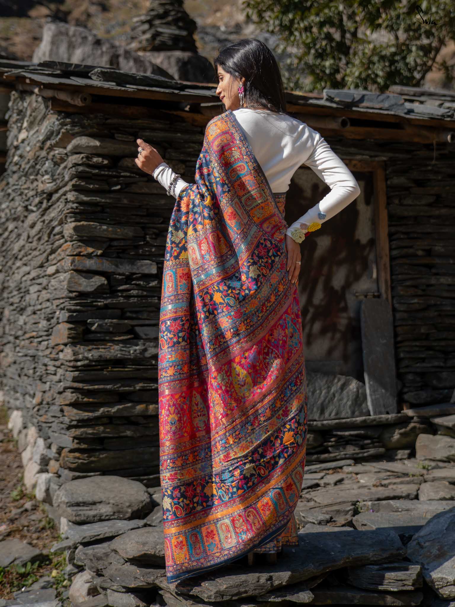 The deep blue base shines with colourful woven motifs, inspired by Kashmiri artistry and serene mountain evenings. Warm, elegant, and easy this saree blends tradition with modern charm.