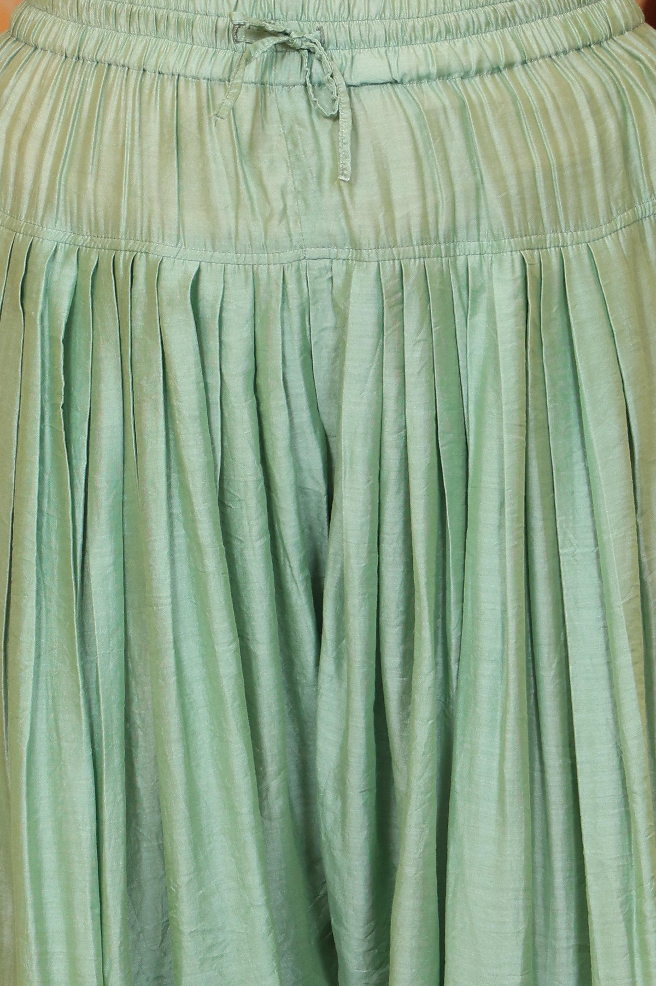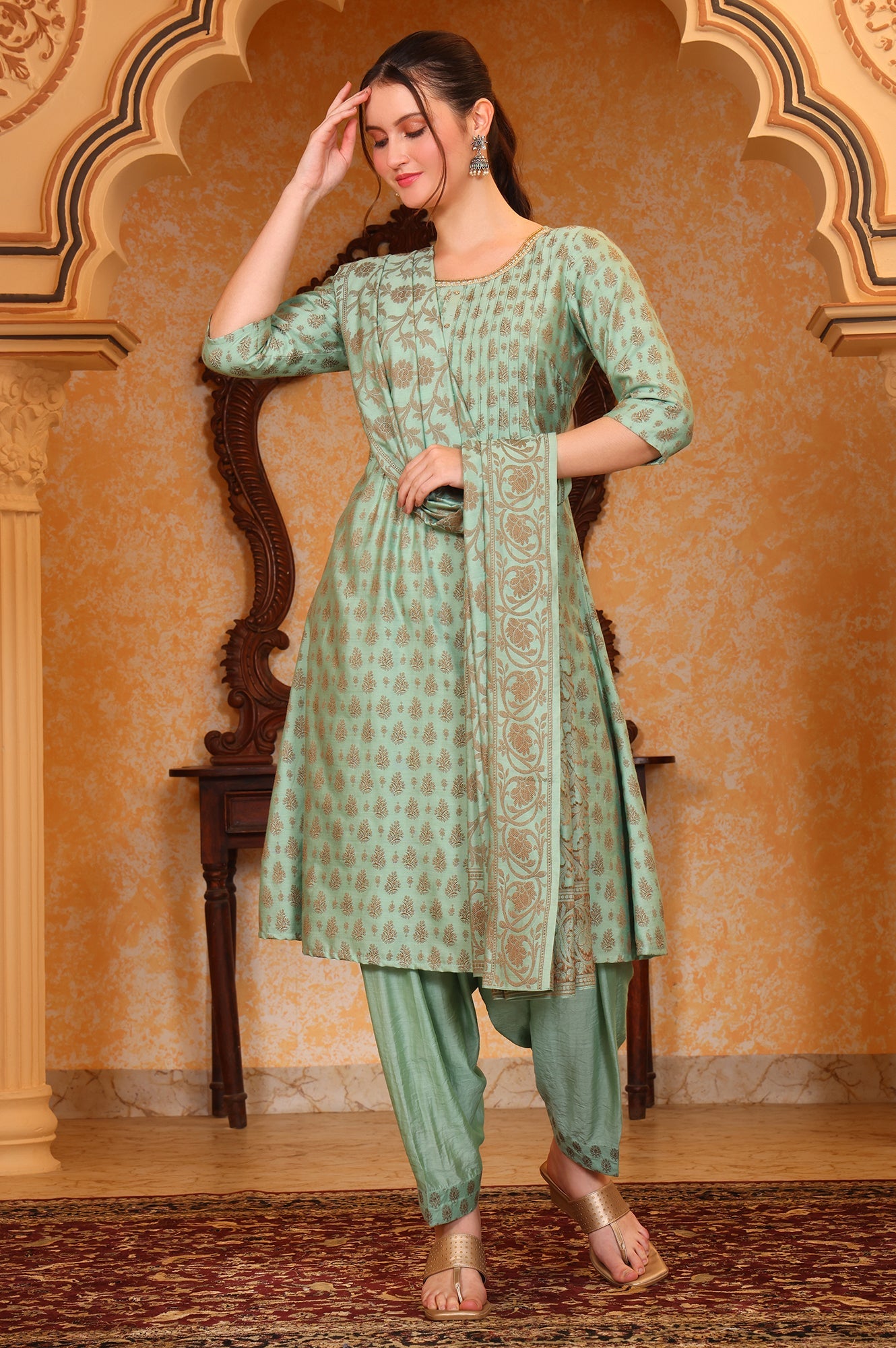 Aqua Abstract Printed Beads Embellished A-Line Jacquard Kurta, Salwar and Dupatta Set