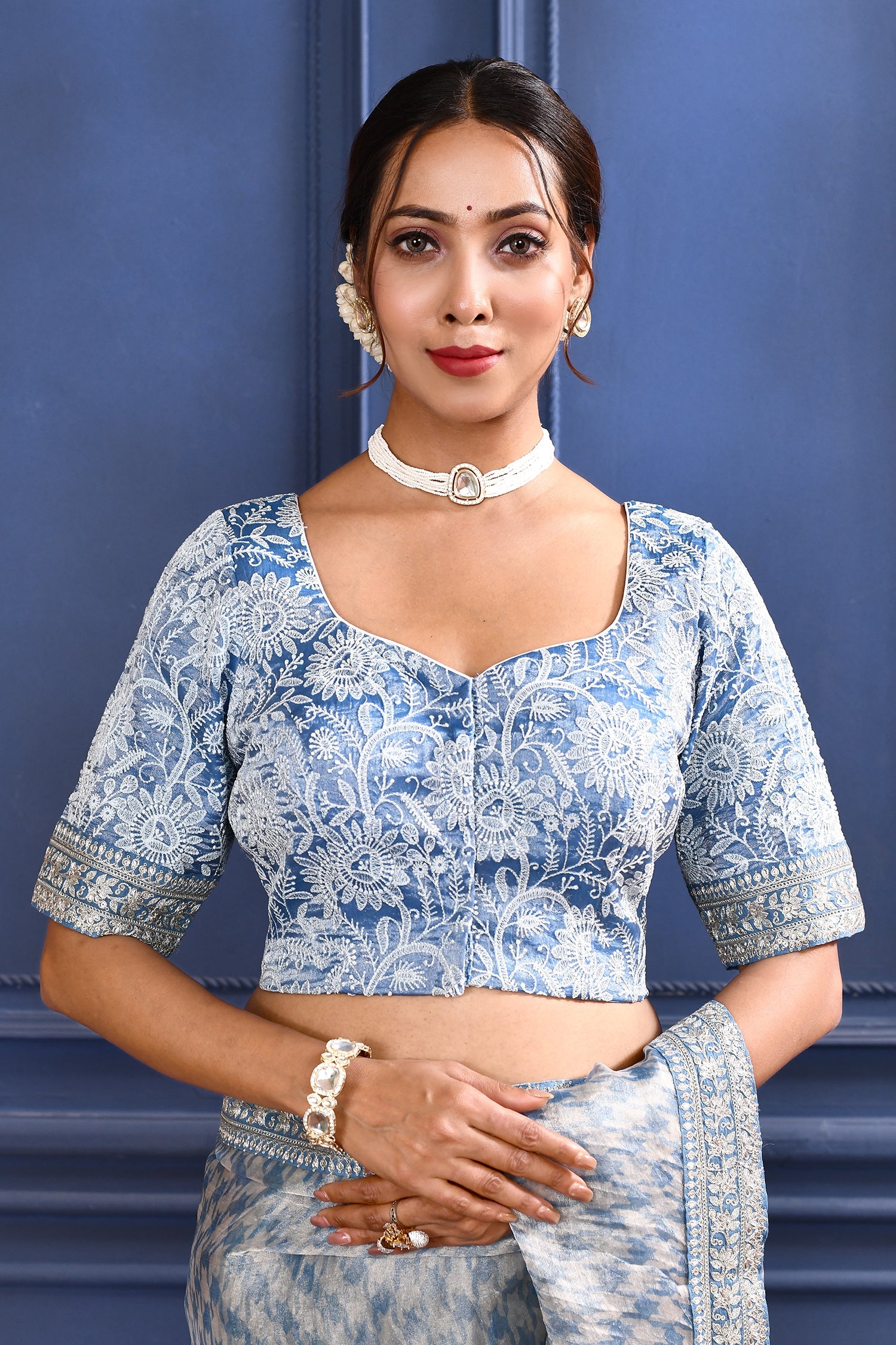 The aqua blue printed tissue saree with embroidered self border and stitched blouse for a stunning look with traditional elegance.