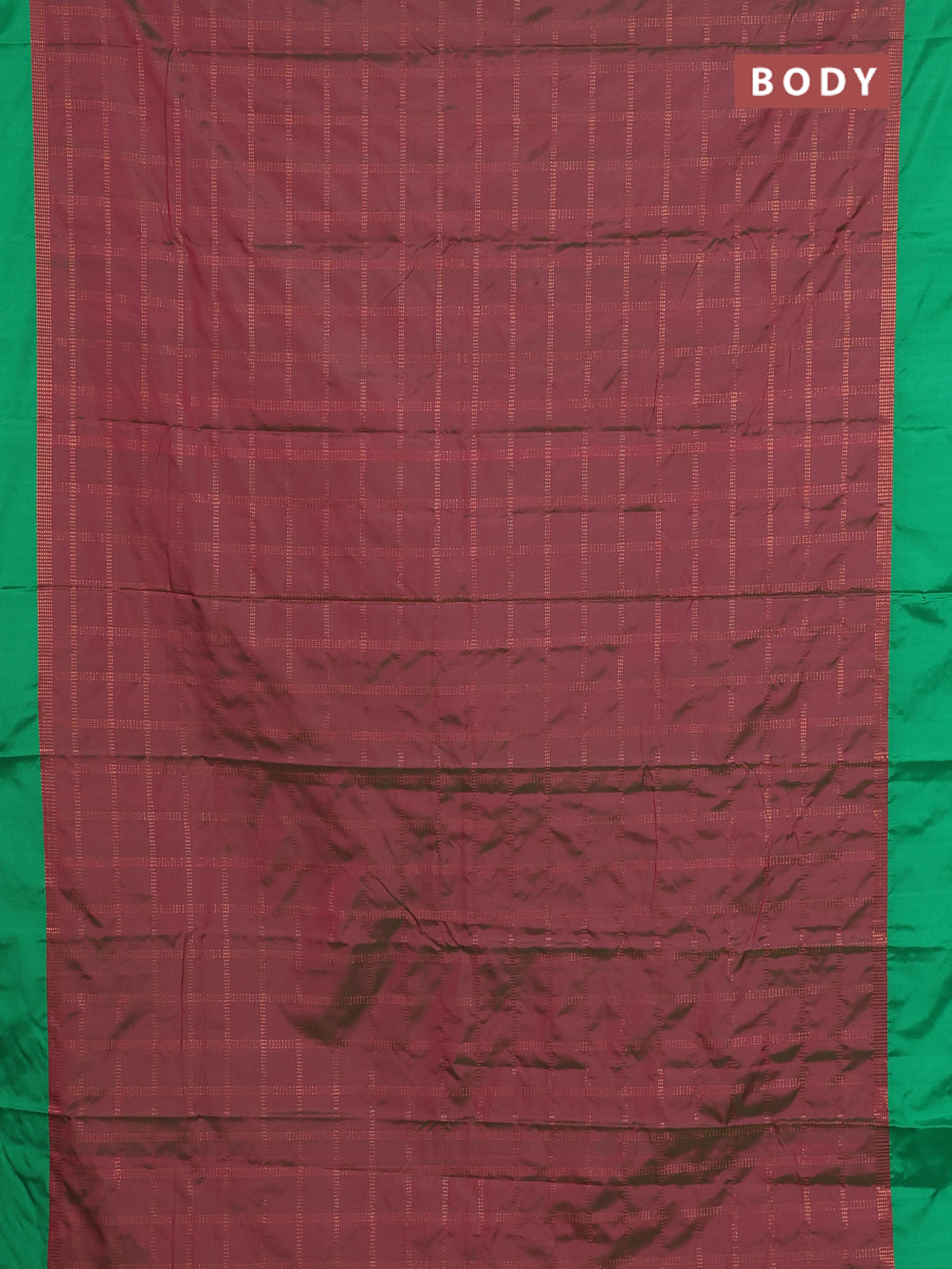 Arani semi silk saree dual shade of maroon and green with allover copper zari checked pattern and copper zari woven simple border