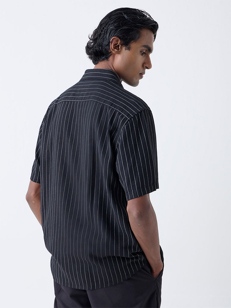 This black shirt from Ascot is patterned with stripe prints that add a touch of character to the look. Crafted from soft, breathable fabric, it ensures comfort and ease through the day. Designed in a relaxed frame with a semi-spread collar, a button-up front and short sleeves, it makes an effortless pick for casual dressing.