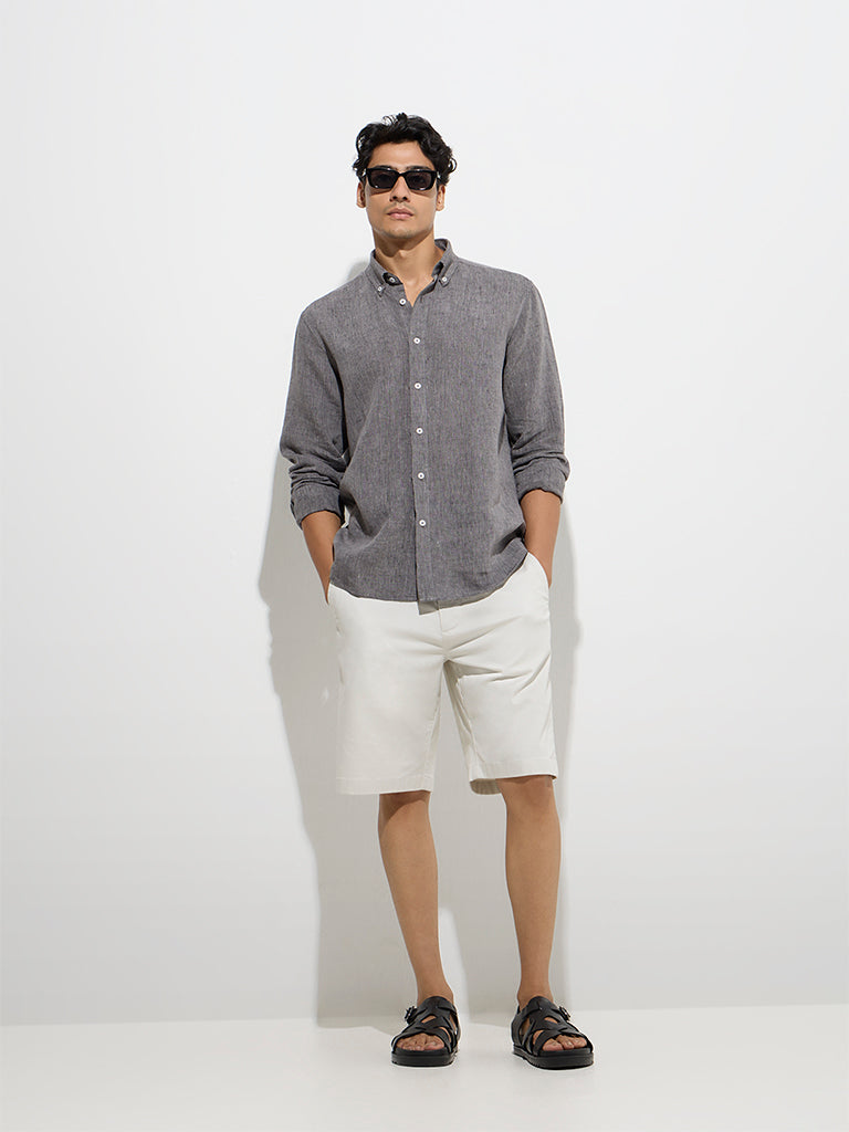 This charcoal shirt from Ascot channels laid-back sophistication with its pure linen construction and textural melange finish. The relaxed silhouette offers ease without compromising on structure, framed by a sharp button-down collar and full sleeves with buttoned cuffs.