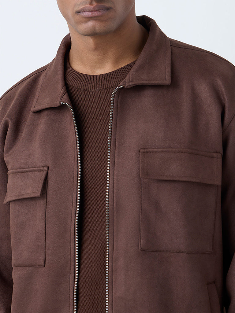 Get your dapper on with this dark brown jacket from Ascot, defined by a smooth suede exterior that gives the silhouette a sophisticated edge. Designed with a spread collar, a zipper front and full sleeves, it is balanced with multiple pockets that add everyday utility. Cut from a premium-blend fabric with a lightweight feel, it stands out as a polished outerwear choice.