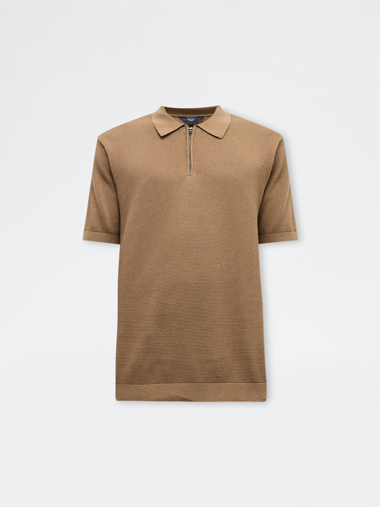 Designed to exude a polished appeal, Ascot introduces this tan polo t-shirt crafted from a soft, breathable fabric that ensures comfort throughout the day. Cut in a relaxed silhouette, it is fitted with a regular collar, short zipper placket and short sleeves. A tactile textured finish lends depth to the structured shape, making it ideal for casual outings.
