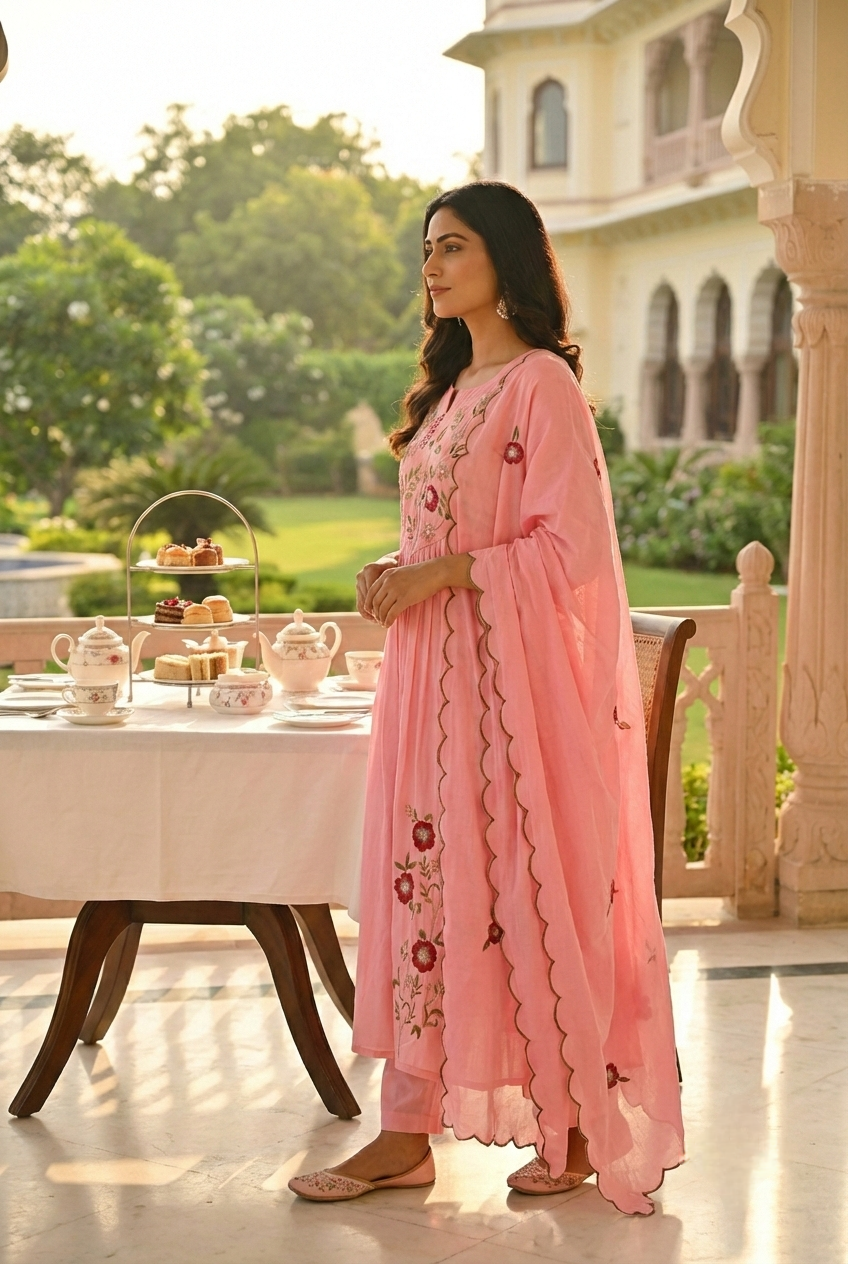 Embrace timeless elegance with this exquisite three-piece set in soft baby pink cotton. Each piece features delicate hand-embroidered floral motifs, showcasing traditional craftsmanship and artisanal detail. The breathable cotton fabric ensures comfort throughout the day, while the intricate embroidery adds a touch of sophistication to your wardrobe. Perfect for special occasions or elevating your everyday style, this versatile set celebrates the beauty of handmade artistry. A cherished addition that honors both quality and cultural heritage.