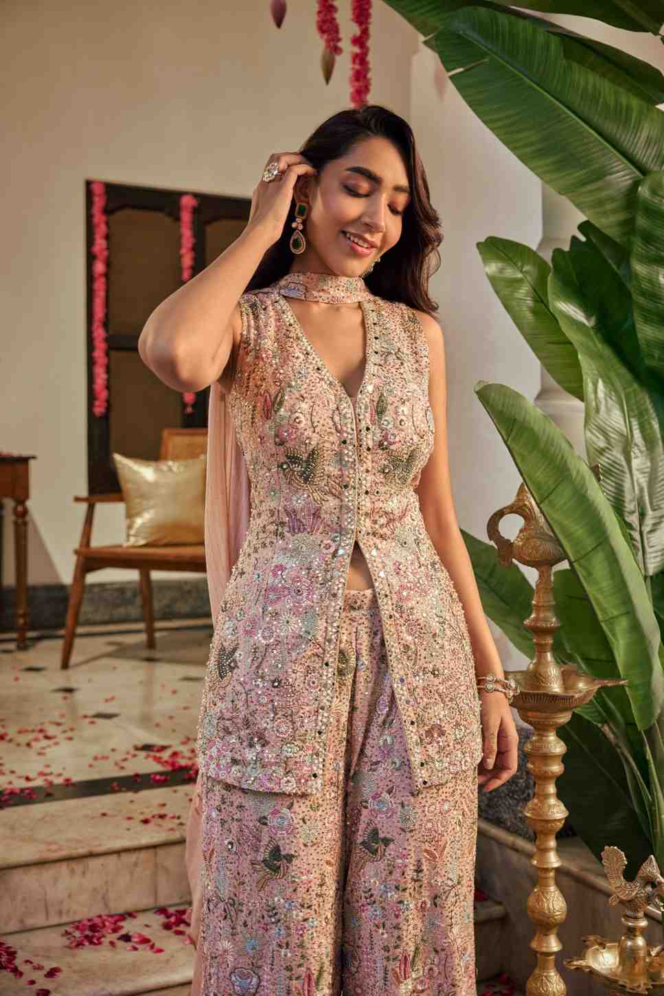 This Baby Pink Georgette Palazzo Set showcases intricate multi-colored heavy embroidery, blending elegance with traditional craftsmanship. The lightweight georgette fabric ensures comfort and fluidity, while the detailed embroidery adds a refined, luxurious touch. Perfect for special occasions, this ensemble offers a sophisticated silhouette that gracefully enhances your style.