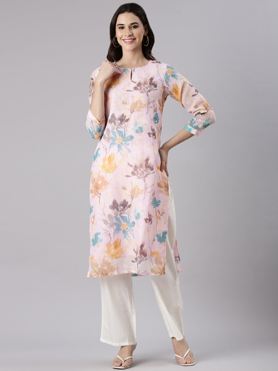 Baby Pink Linen Printed Kurta